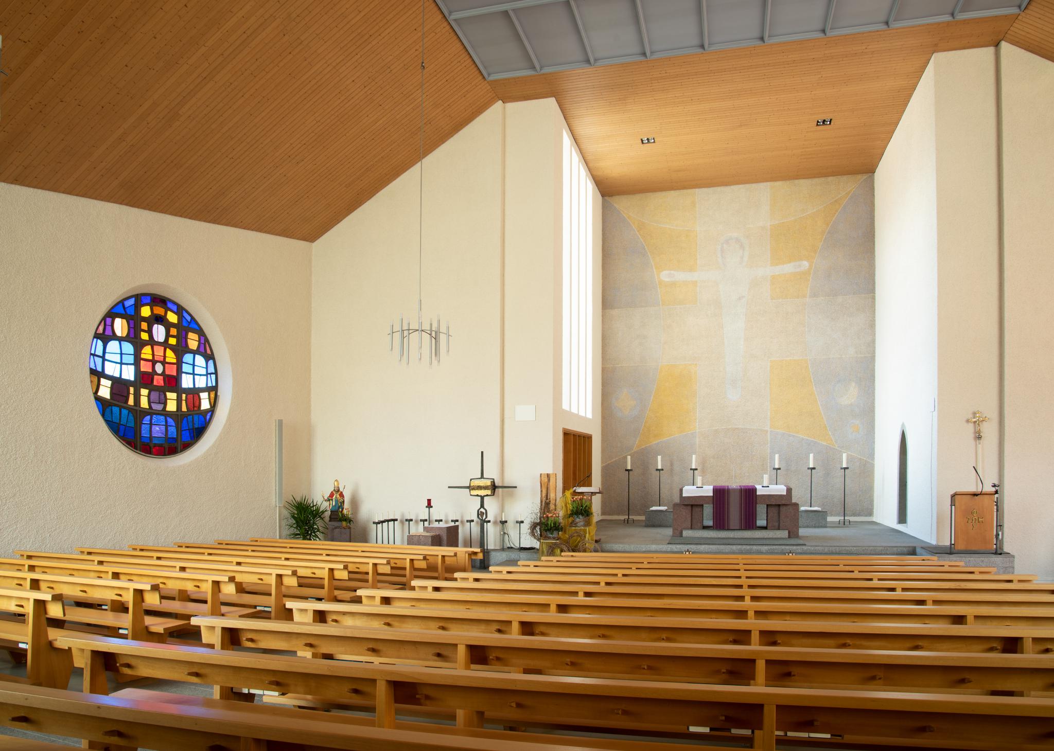 Neubau 1864–65 (von Carl Friedrich Braun) unter Einbezug des Nordturmes der ehemaligen Anlage. Damals schuf der Glasermeister Baumgartner Chorfenster aus Mousselinglas sowie Randverzierungen (kath. Kirchgemeindearchiv, B 12 Protokoll der paritätischen Kirchenbaukommission 1863–1894). Diese Fenster wurden bei der 1962 erfolgten Neugestaltung des Innenraums entfernt, einzelne Fragmente haben sich erhalten.