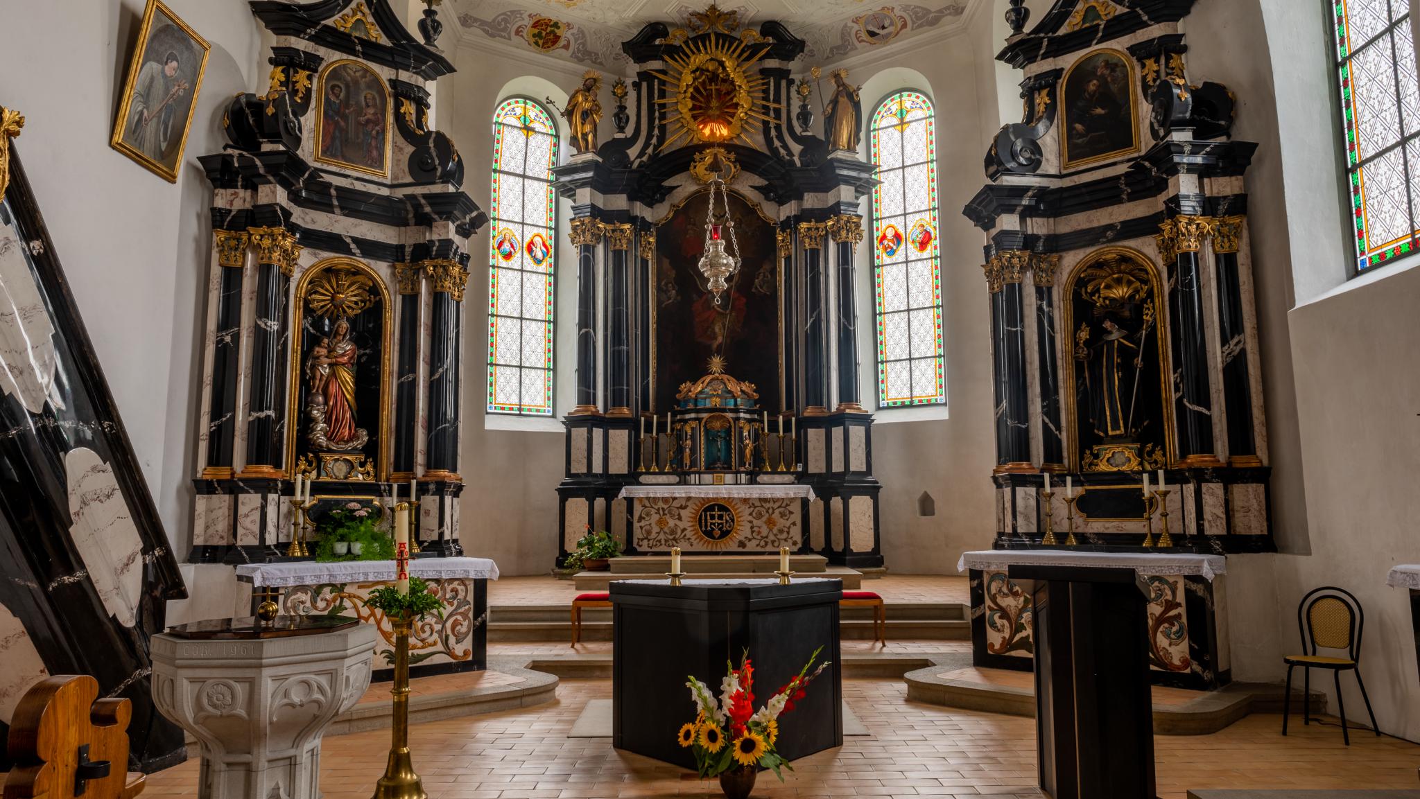 Schlichter, langgezogener Bau unter Satteldach mit Dachreiter und östlichem Polygonalabschluss. Glasmalereien 1881 von Karl Wehrli. In der Sakristei zwei Glasgemälde 1953 von Werner Schaad.