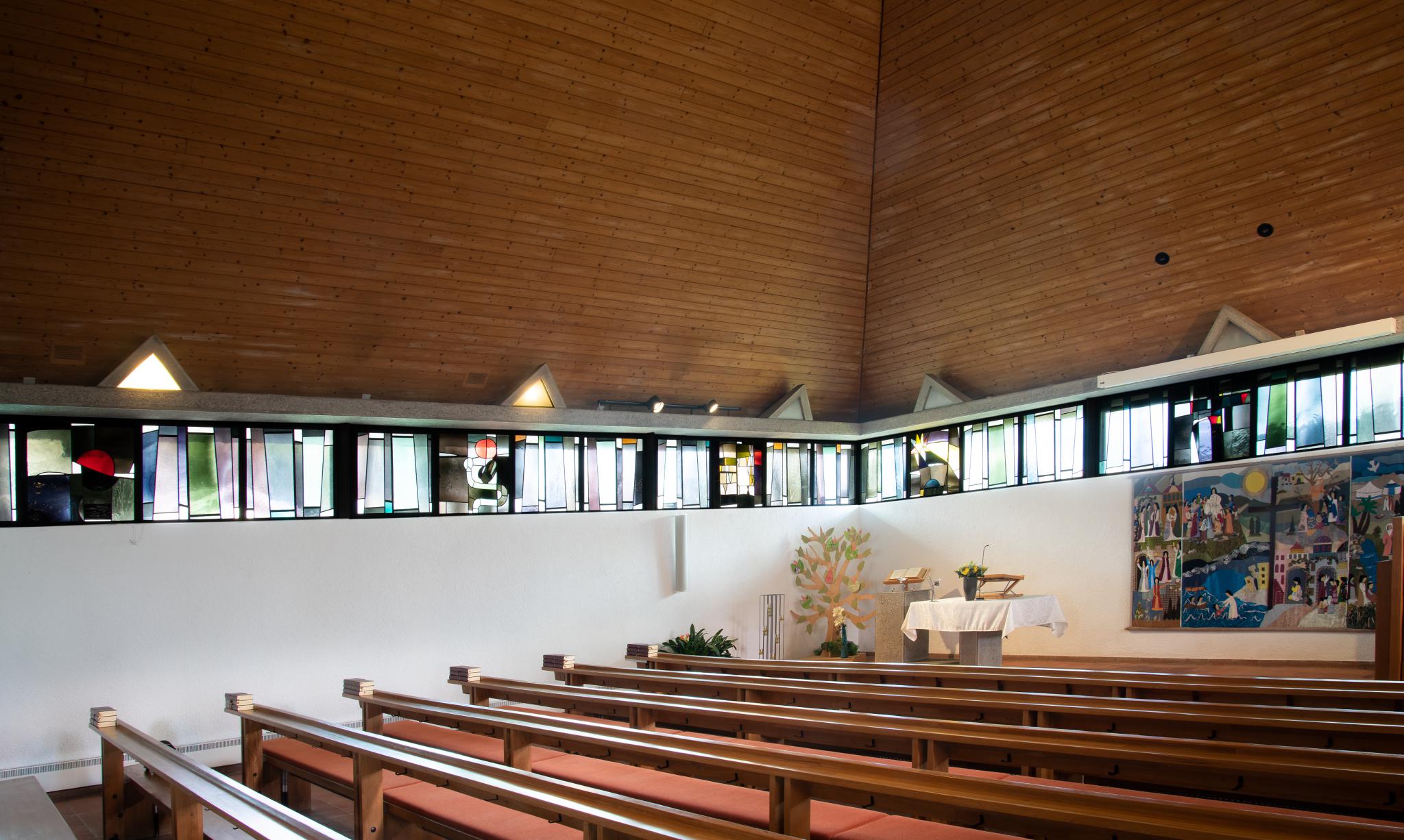 1960 von Edwin Rausser nach dem Modul von Le Corbusier erbaut. Fensterband, entworfen von Köbi Lämmler und ausgeführt durch Andreas Kübele, mit stilisierten Darstellungen biblischer Themen.