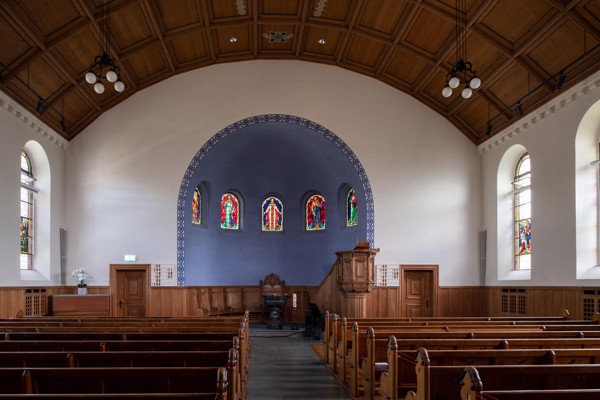 1915–16 von Brenner & Stutz (Frauenfeld) über den Fundamenten eines romanischen Apsidensaals und unter Verwendung von Bauteilen um 1300 (Chor mit Wandmalereien) im Heimatstil erbaut. Kompakter Bau unter hohem Giebeldach mit Dachreiter. Eine fünfjochige Vorhalle öffnet die südwestliche, leicht asymmetrisch komponierte Fassade. Glasmalereien von Ernst Linck und Otto Abrecht, ausgeführt von Kirsch & Fleckner (Fribourg) und Jakob Lieberherr (Frauenfeld). Innenrenovation und Chorneugestaltung 2006.
