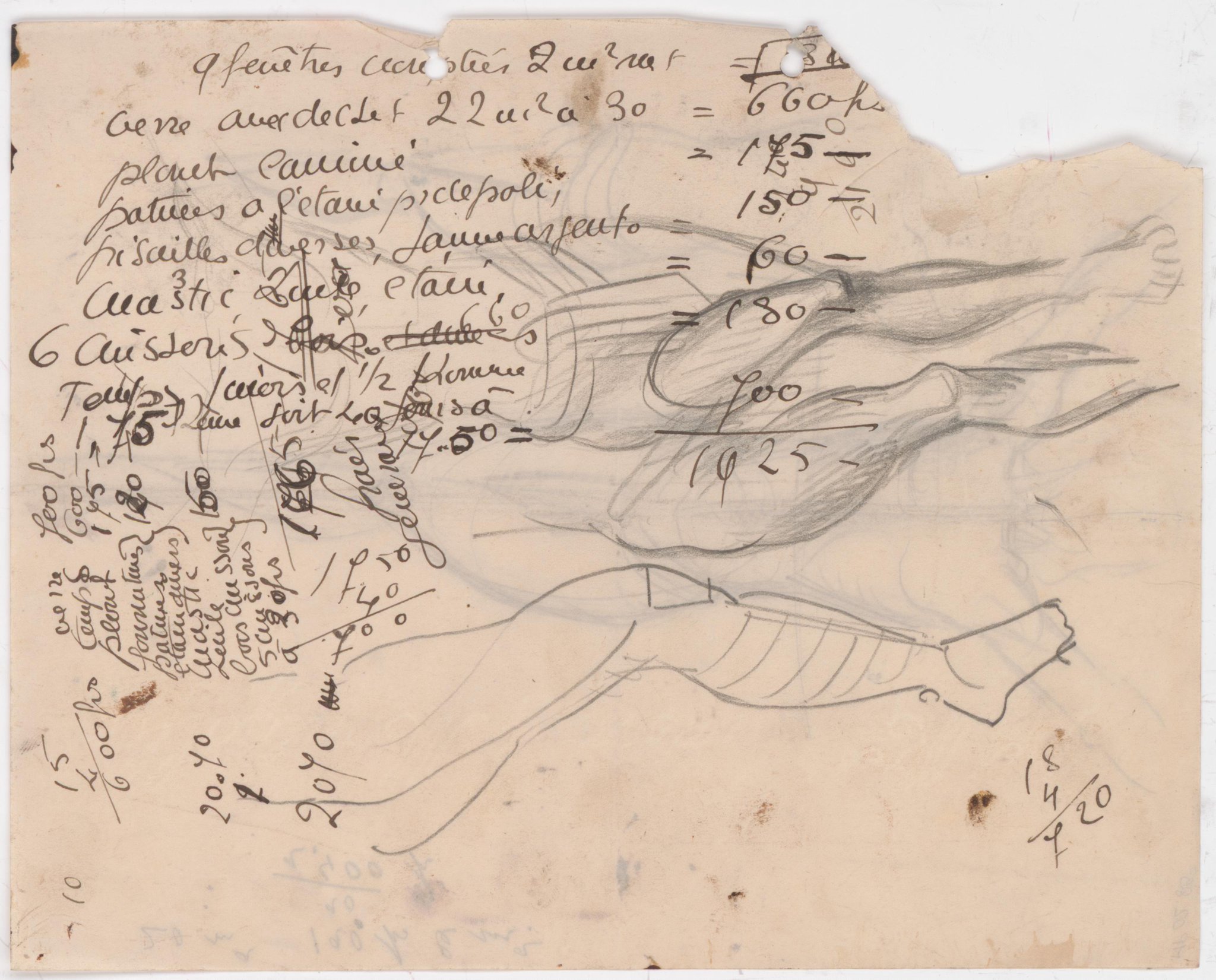 Esquisse des jambes et du corps du Christ au verso d'un projet avec différentes esquisses, annotations et mesures pour le vitrail de la Crucifixion de la cathédrale de Lausanne