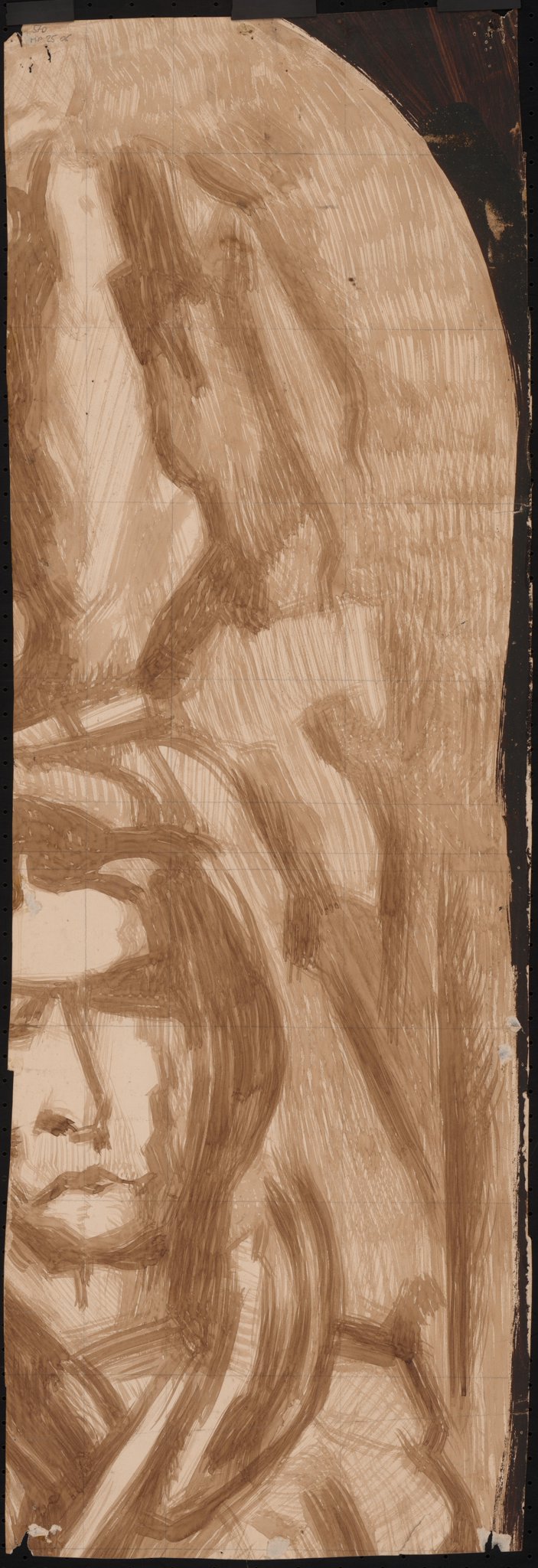 Partie d'un personnage à la sépia dont on ne voit que le visage (probablement un autre projet réutilisé au recto) au verso d'un projet avec saint-Jean-Baptiste pour les vitraux de l'église Saint-Maurice de Veyrier.