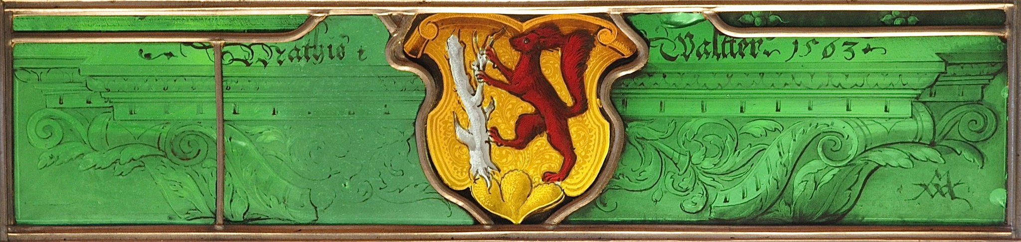 Vaterunser-Scheibe (Fragment), mit (entferntem) Wappen Mathis Walther