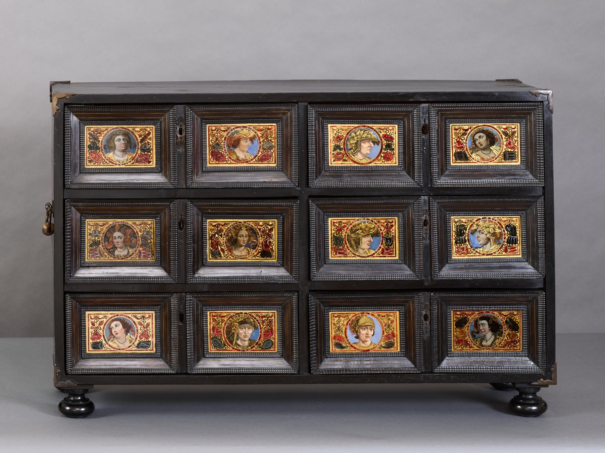 Kabinettschrank mit Hinterglaseinlagen von Cäsaren- und Sibyllenköpfen