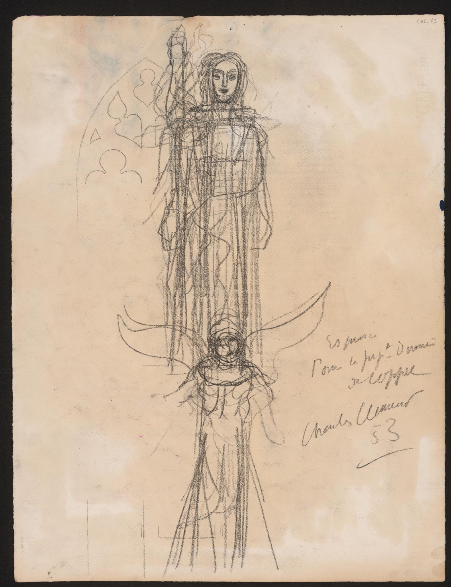 Croquis au crayon ou la craie grasse pour la figure du christ et d'un ange avec ébauche d'un remplage de vitrail.