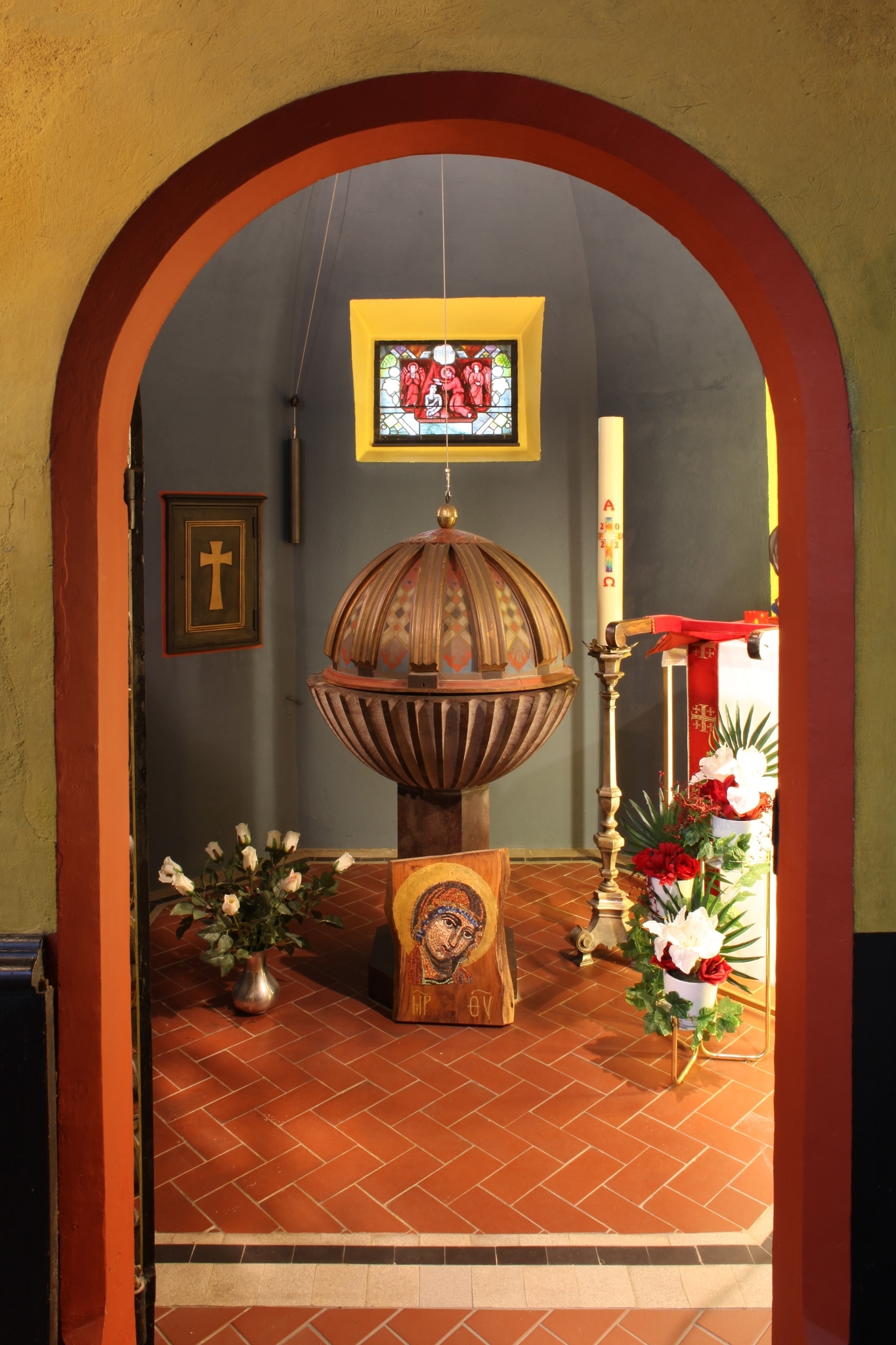 Vue intérieure de l'église Notre-Dame-de l'Assomption de Finhaut (baptistère)