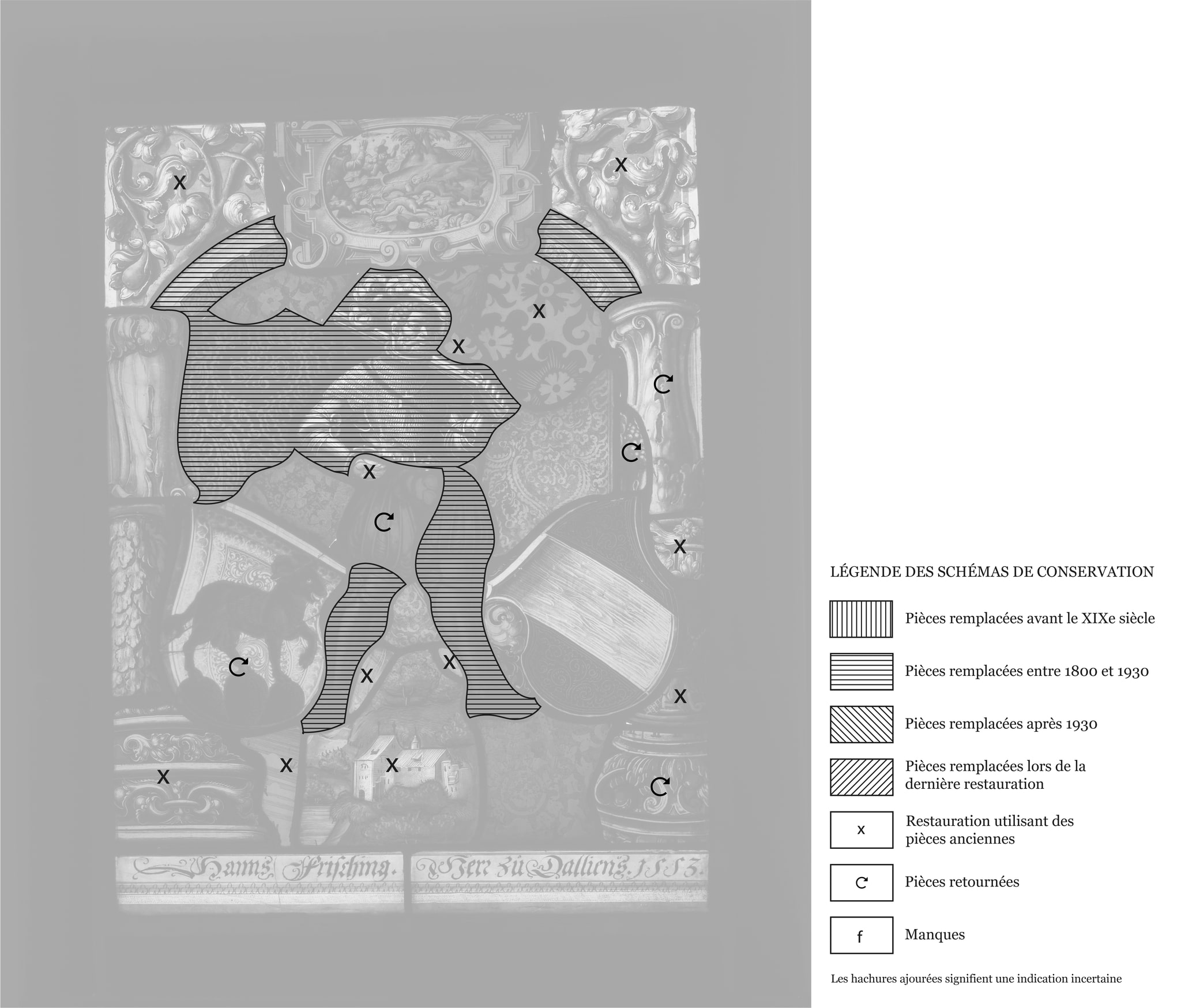 Schéma du vitrail aux armes de Hans Frisching et Tillier