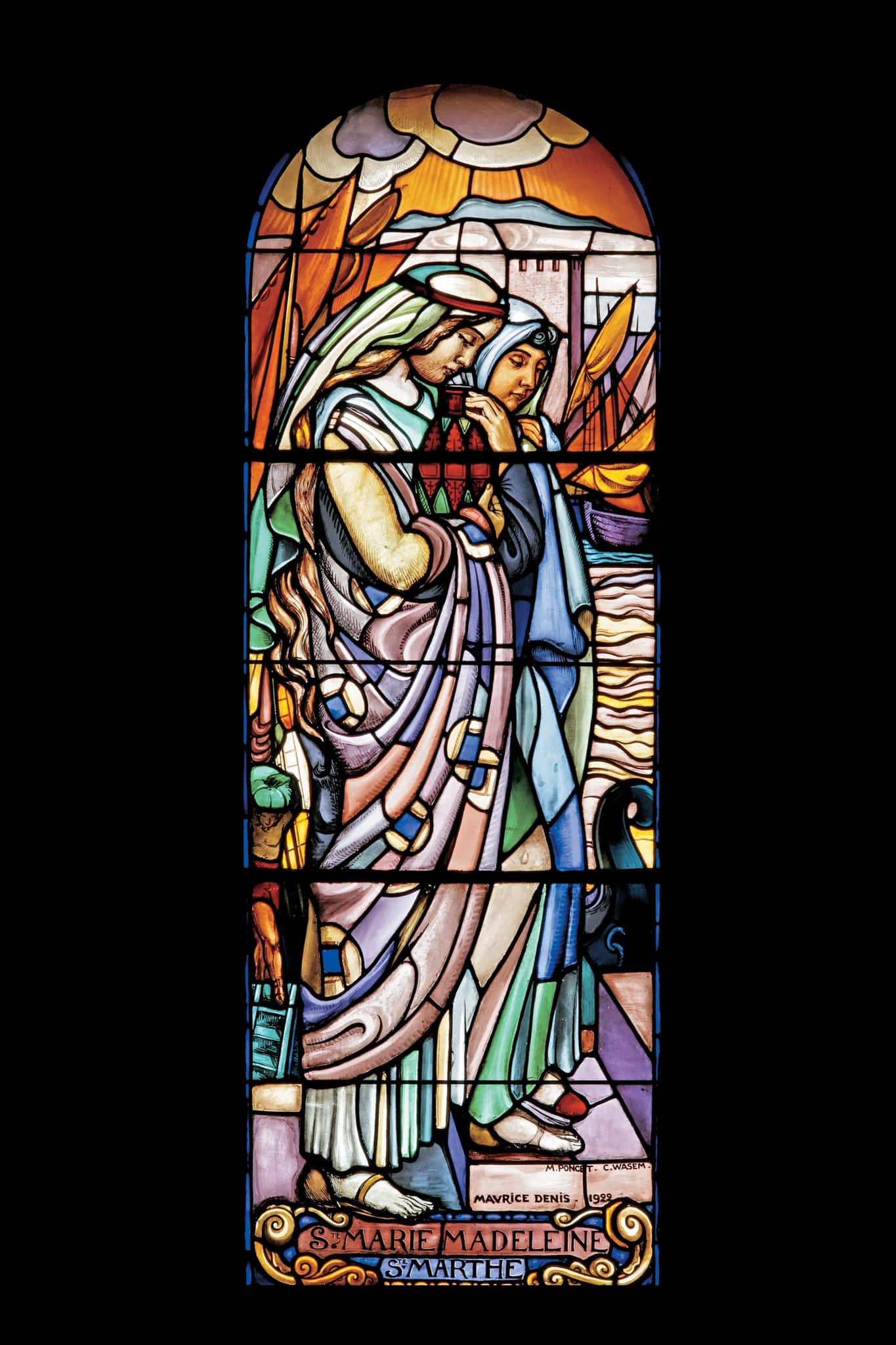 Marie-Madeleine et sa soeur Marthe sont représentées sur ce vitrail débarquant sur le sol provençal à Marseille, comme l’évoque la Légende Dorée de Jacques de Voragine, racontant qu’elles furent, avec d’autres fidèles, mises dans un bateau et abandonnés sur la mer sans pilote. L’embarcation aborda miraculeusement à Marseille (Voragine, 1902, p. 255).