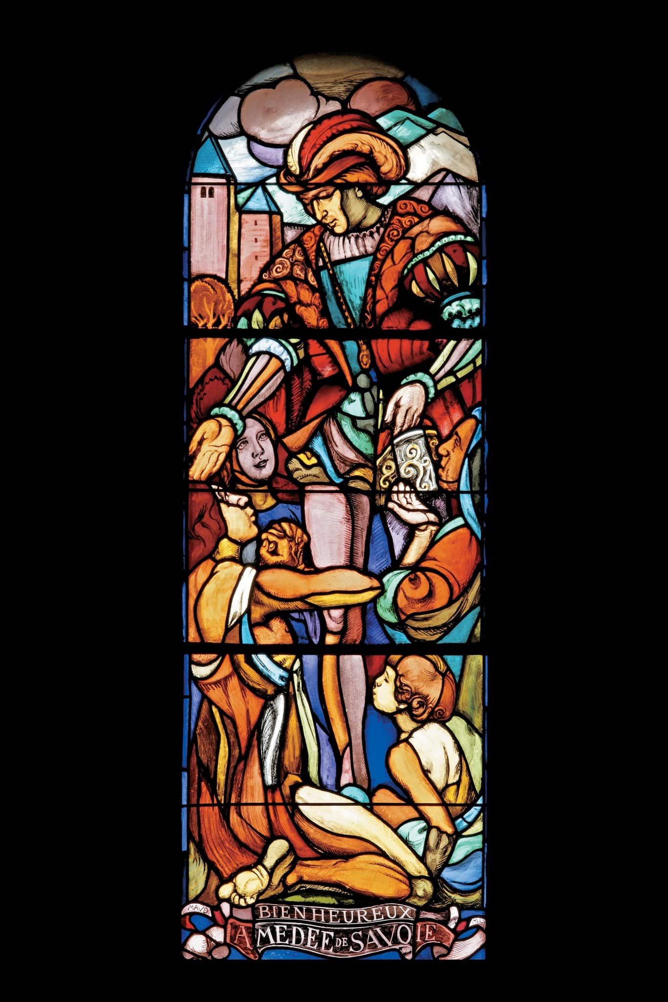 Ce vitrail en plein cintre consacré au Bienheureux Amédée de Savoie a été réalisé en 1918 par Maurice Denis en collaboration avec Marcel Poncet, pour l’une des fenêtres hautes de la nef de l’église Saint-Paul de Cologny (GE), dans le quartier de Grange-Canal. Amédée, malgré son envie de rentrer dans les ordres, dut épouser Yolande de France, fille de Charles VII. Durant sa courte vie, il fit preuve d’une grande piété et de charité auprès des pauvres.
