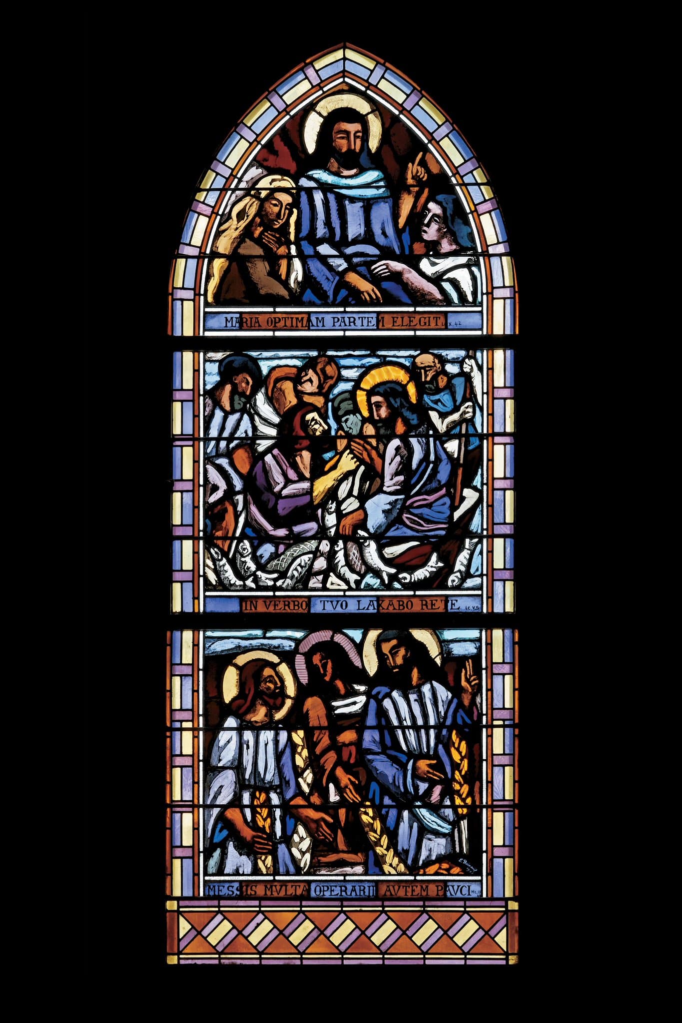 Maria optimam partem eligit, Lc X.42 / in verbo tVo lavabo rete, Lc V.5 / Messis mVlta operarit aVtem paVci, Mt IX 37 (bandeau sous chaque scène)