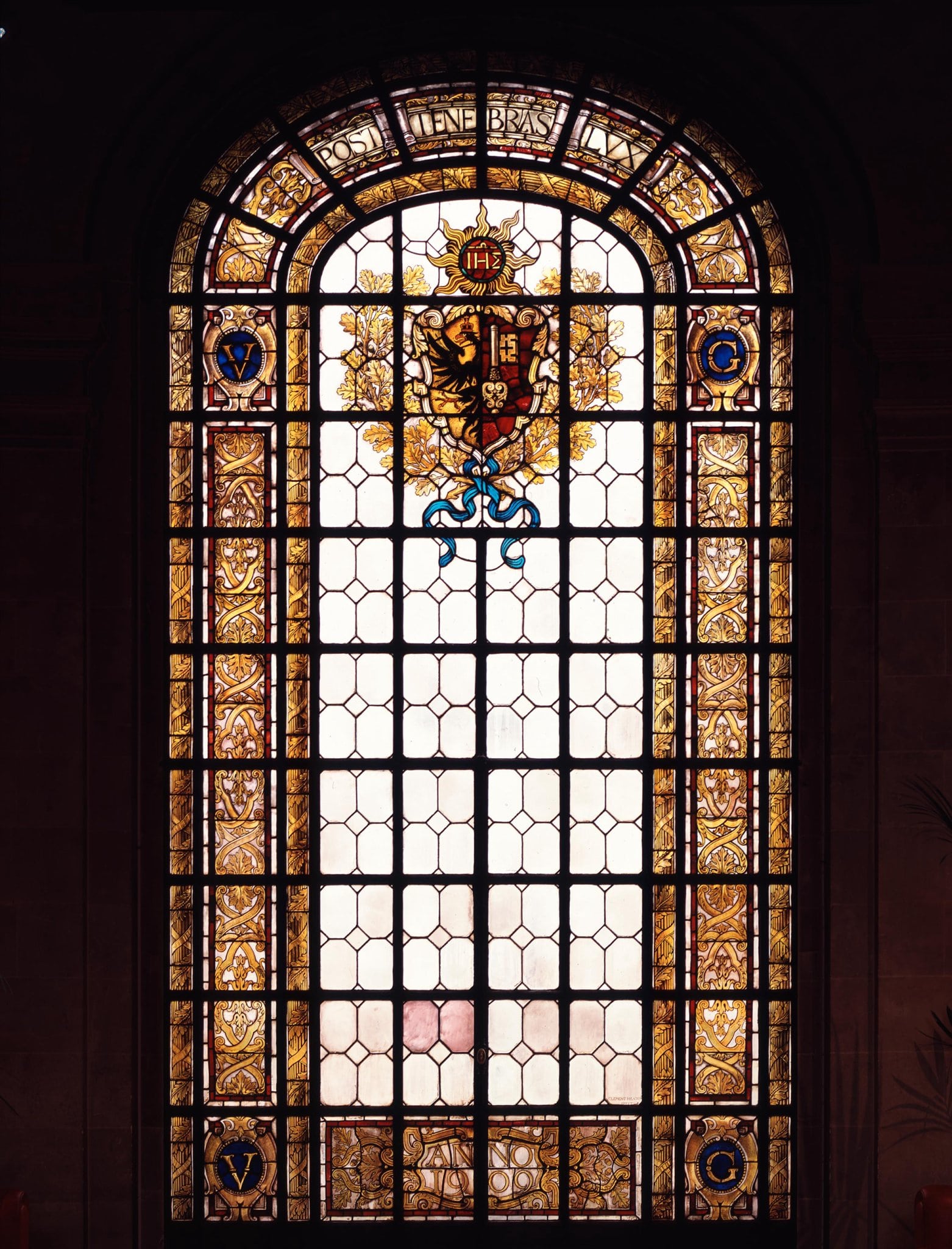 Les armoiries de Genève dominent ce vitrail monumental composé de bornes. Des motifs végétaux forment l’encadrement du vitrail.