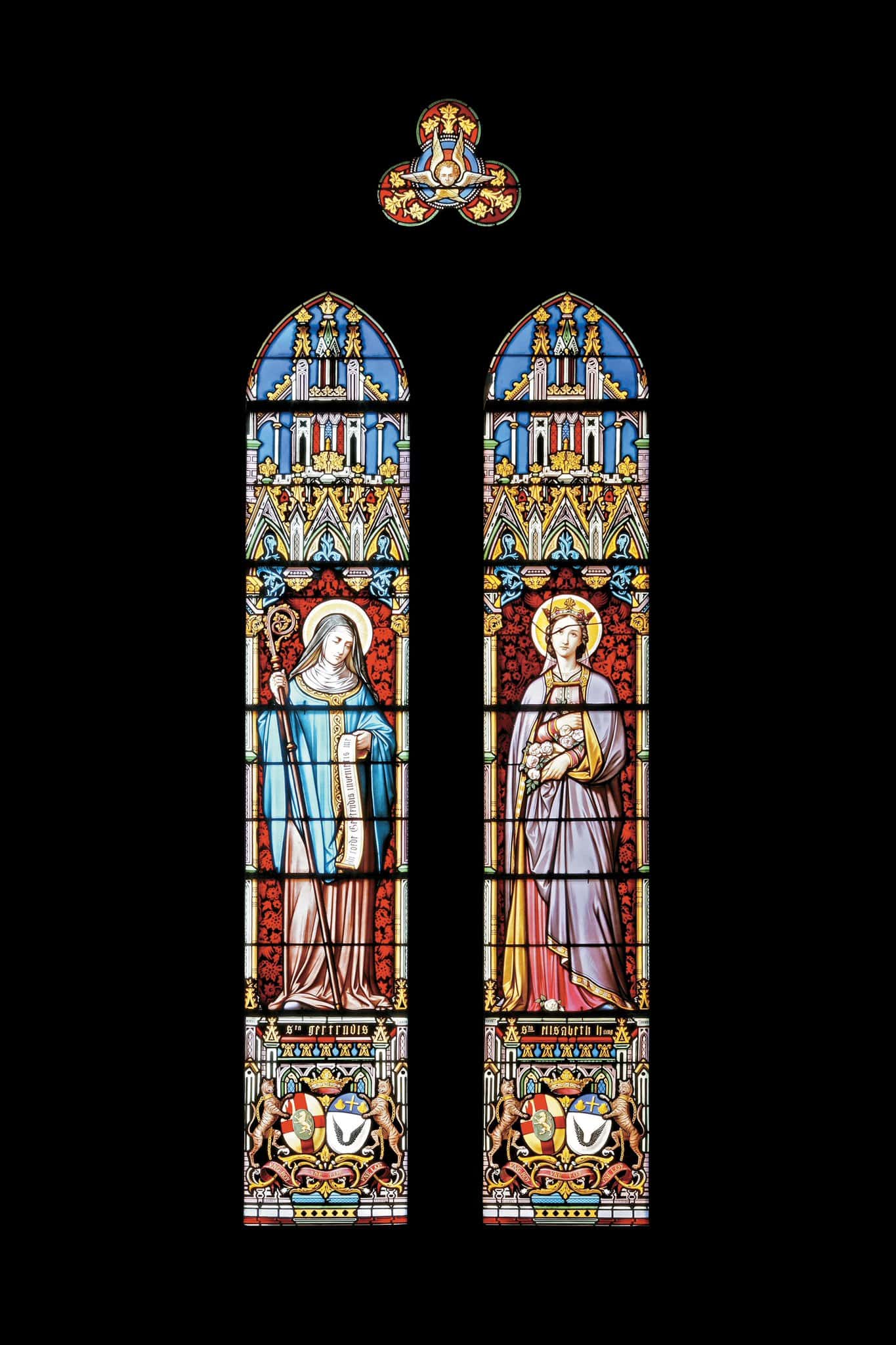 Sur la lancette de gauche, sainte Gertrude, en habit de cistercienne, tient une mitre. En bas, les armoiries du donateur. Sur la lancette de droite, sainte Elisabeth de Hongrie, couronnée, tient des roses dans un pan de sa robe. En bas, les armoiries du donateur