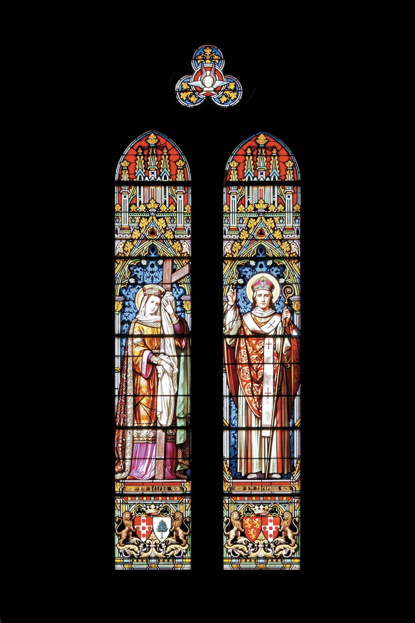 Sur la lancette de gauche, sainte Hélène, en impératrice, porte la croix. En-dessous, les armes du donateur. Sur la lancette de droite, saint Théophile, évêque d’Antioche, porte le pallium à l’orientale et tient une crosse. En-dessous, les armes du donateur