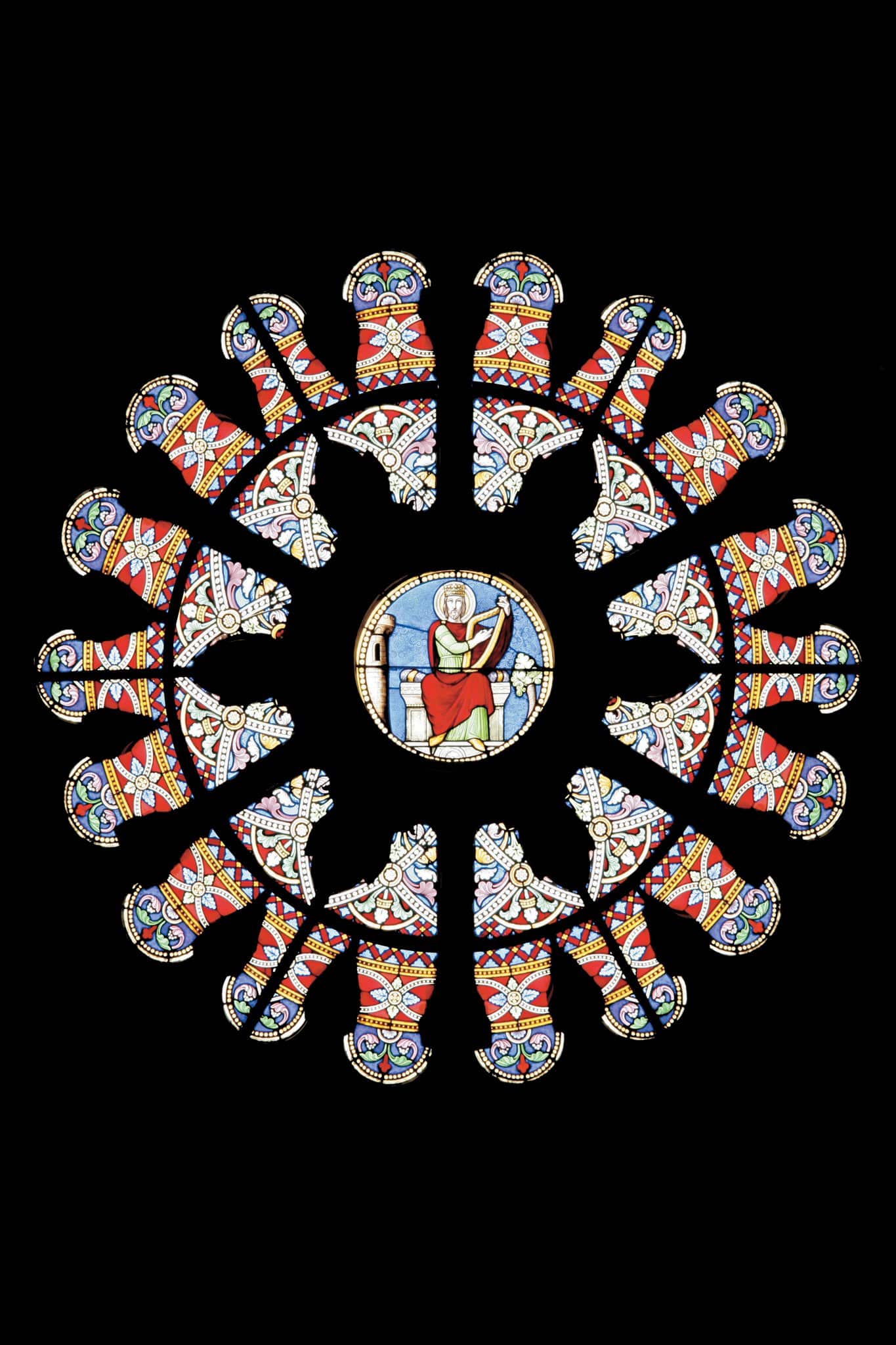 Décor végétal et géométrique avec au centre un médaillon où David joue de la harpe.