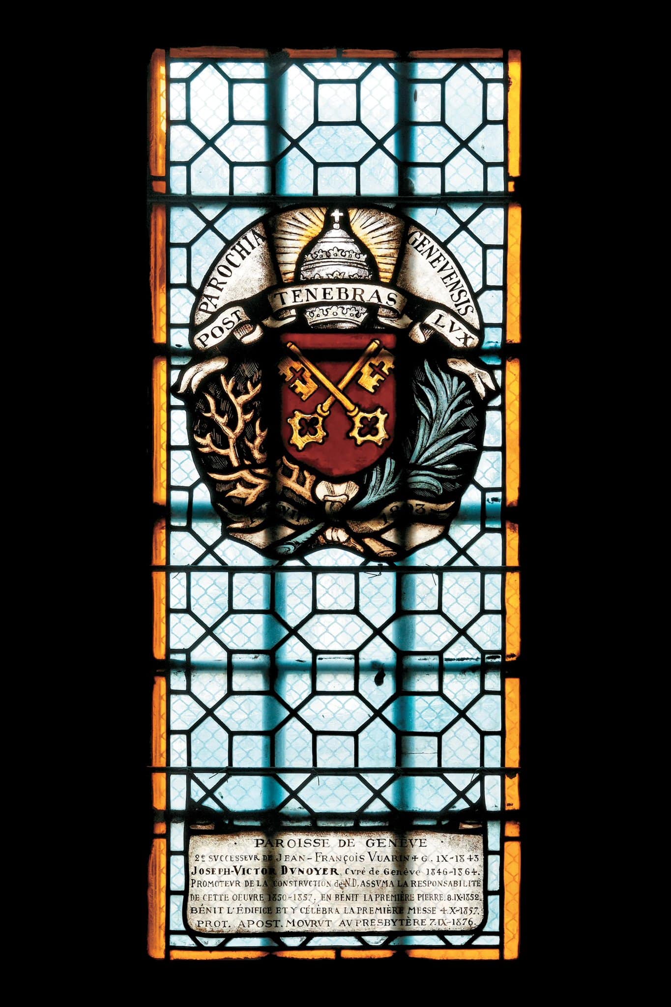 PAROCHIA / GENEVENSIS (au-dessus des armoiries) / POST TENEBRAS LUX (armoiries) / PAROISSE DE GENEVE / 2e SUCCESSEUR DE JEAN-FRANCOIS VUARIN † 6.IX-1843 / JOSEPH-VICTOR DUNOYER, CURE DE GENEVE 1846-1864. / PROMOTEUR DE LA CONSTRUCTION DE N.D., ASSUMA LA RESPONSABILITE / DE CETTE OEUVRE 1850-1857; EN BENIT LA PREMIERE PIERRE. 8.IX-1852. / BENIT L’EDIFICE ET Y CELEBRA LA PREMIRE MESSE 4.X-1857. / PROT. APOST. MOVRVT AV PRESBYTERE 7.IX-1876 (cartouche)