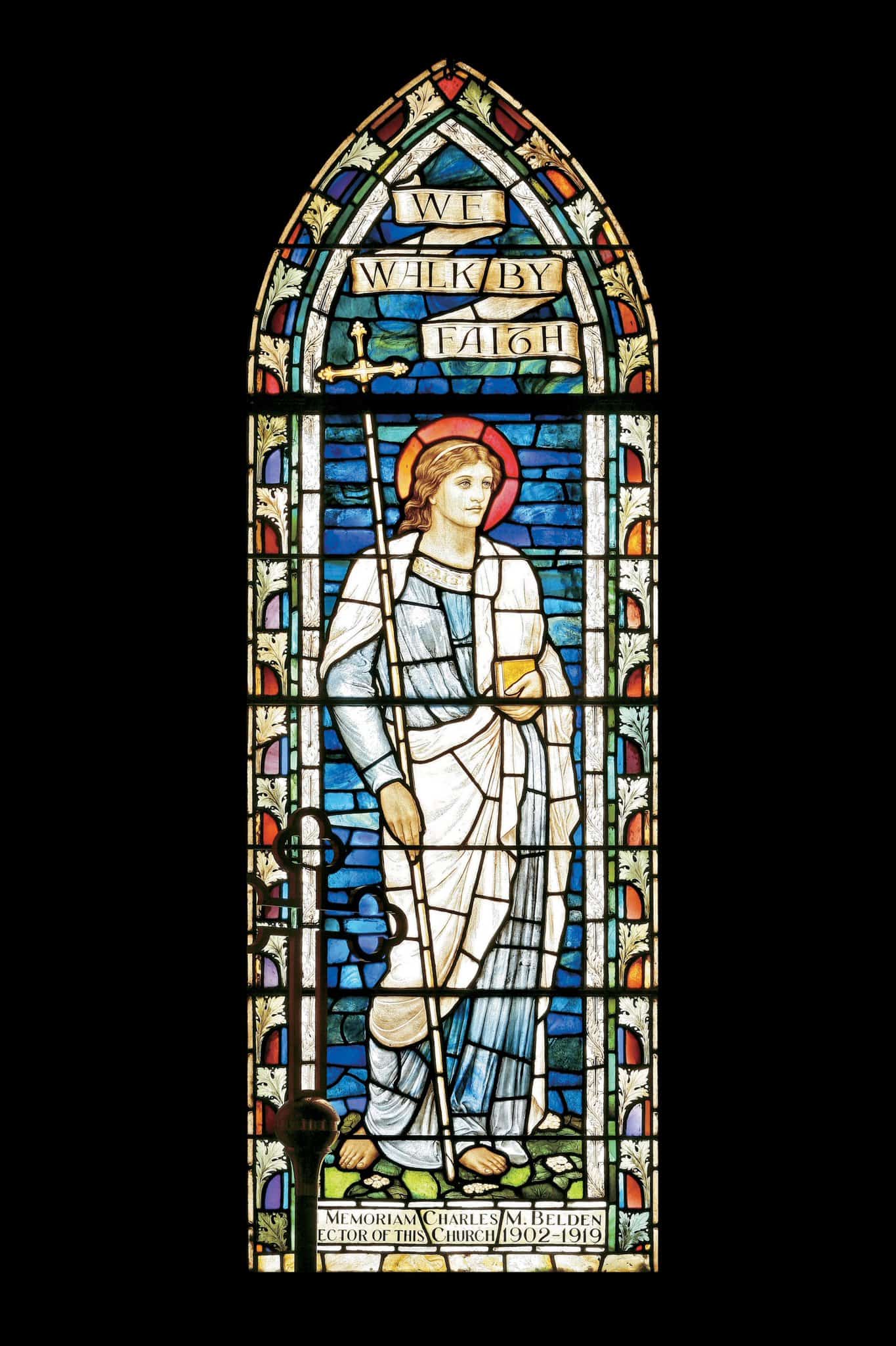 WE / WALK BY / FAITH (banderole en haut) / IN MEMORIAM CHARLES M. BELDEN / RECTOR OF THIS CHURCH 1902-1919 (bandeau sous la sainte)