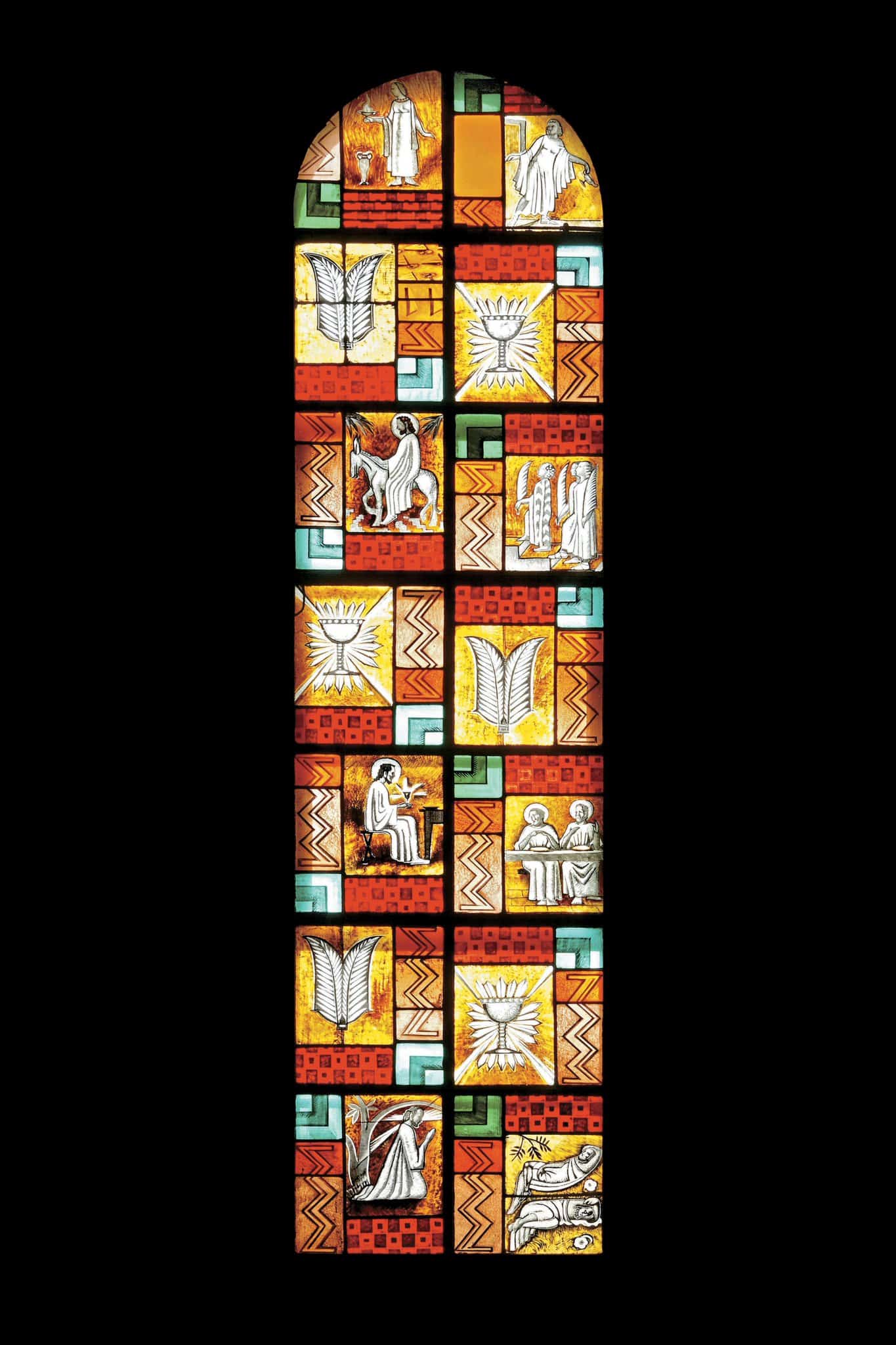 Des rectangles décoratifs s’alternent à des rectangles illustrant une parabole et des scènes de la vie du Christ. De haut en bas : les Vierges sages et les Vierges folles, Jésus sur un âne entre à Jérusalem, acclamé par la foule, la Sainte Cène, Jésus prie au jardin des oliviers alors que deux apôtres dorment. Un calice et deux palmes apparaissent entre chaque scène.