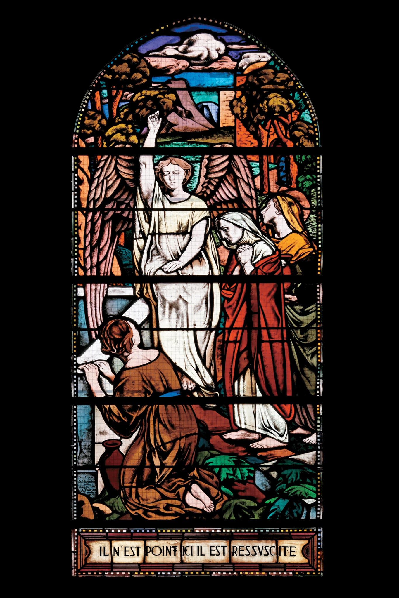 Devant le tombeau vide, un ange montre le ciel et dit aux trois femmes que le Christ est ressuscité.