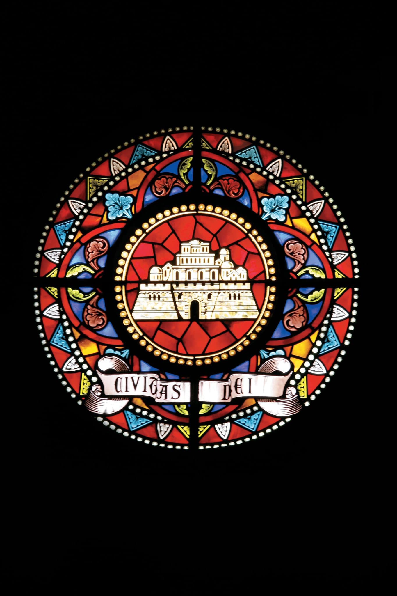 Une rose aux motifs végétaux avec au centre la cité de Dieu
