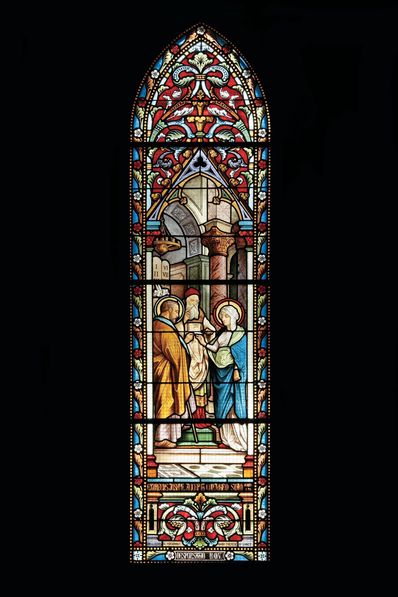 EXURGENS JOSEPH ACCEPIT CONJUGEM SUAM MATH. I.24 (bandeau sous la scène) / DON des ELEVES DU PENSIONNAT MARIE-THERESE GD LANCY (bandeau en bas) / DESPONSATIO B.M.V. (cartouche sur la bordure en bas au centre)