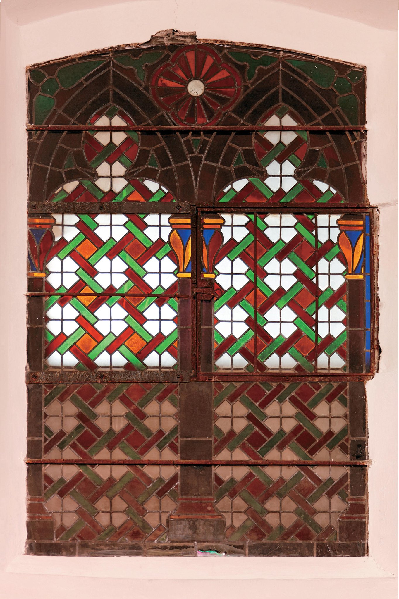 Décor composé de bornes inscrit entre des colonettes avec une fleur dans un quadrilobe au sommet entre les deux lancettes.