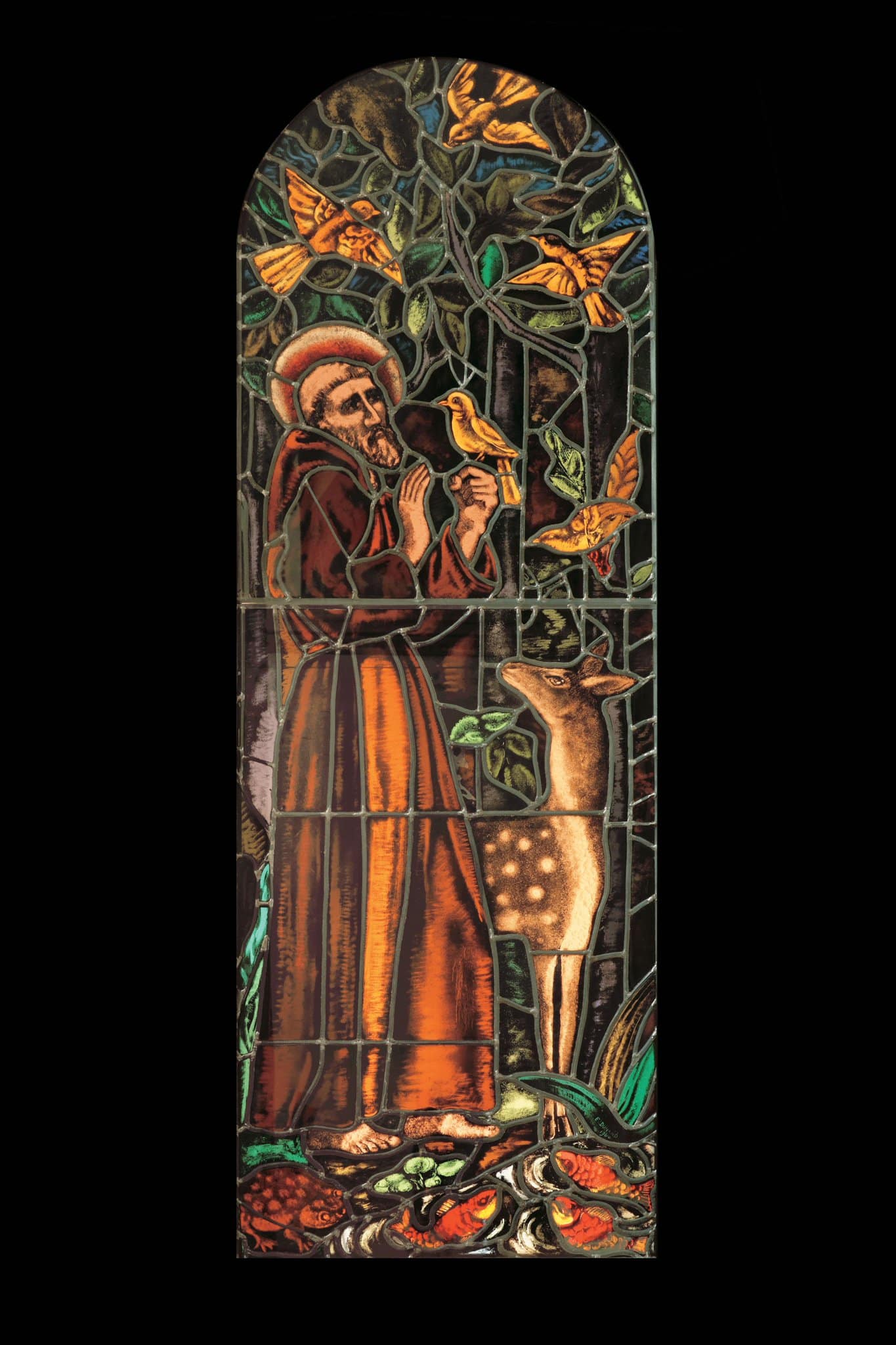 Saint François au milieu des oiseaux. A ses côtés, une biche le regarde et à ses pieds nagent des poissons.