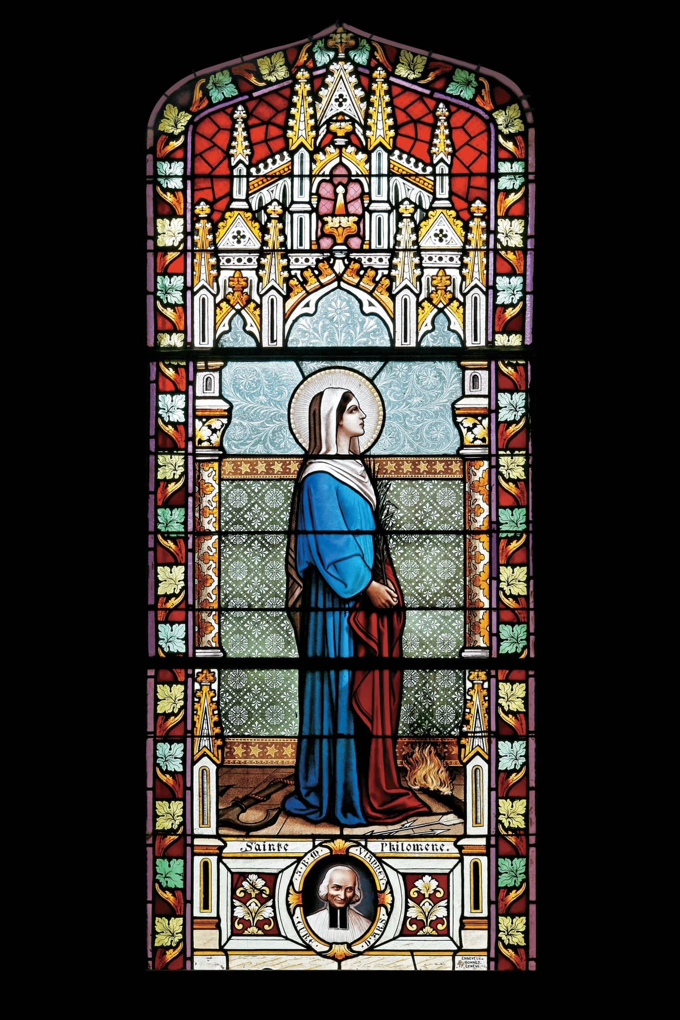Sainte Philomène voilée, les mains jointes, porte la palme du martyre. A ses pieds, une ancre, une torche allumée et des flèches. En-dessous, le portrait du curé d’Ars dans un médaillon.