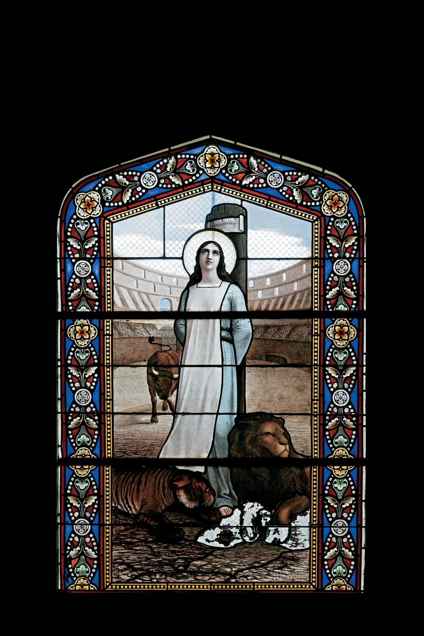 Sainte Blandine, attachée à un pieux, est au milieu d’une arène, un tigre et un lion couchés à ses pieds. Derrière elle, un taureau la charge.
