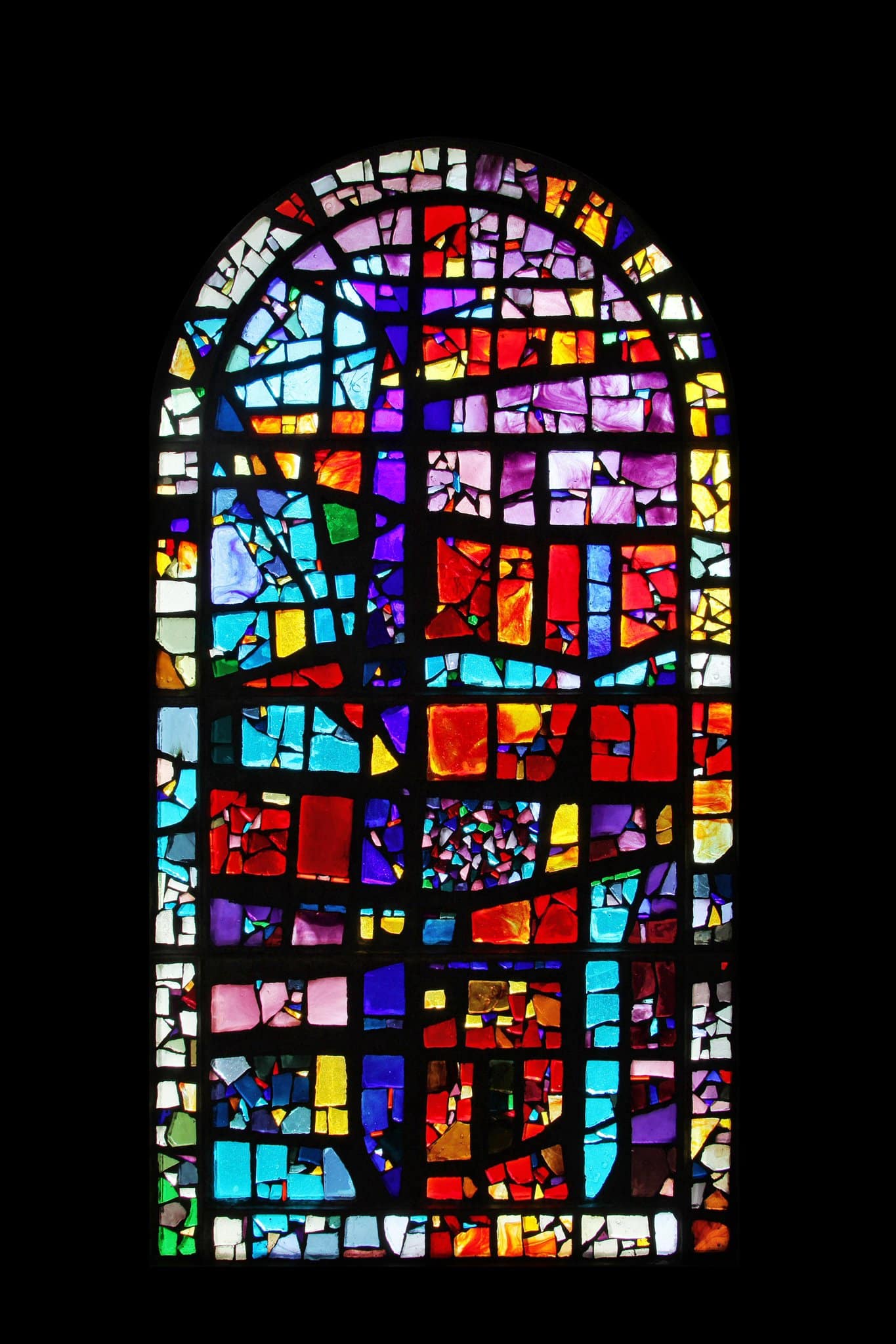 Dalle de verre non figurative composée d’une mosaïque de verres aux tailles et aux teintes très diverses et d’une bordure.
