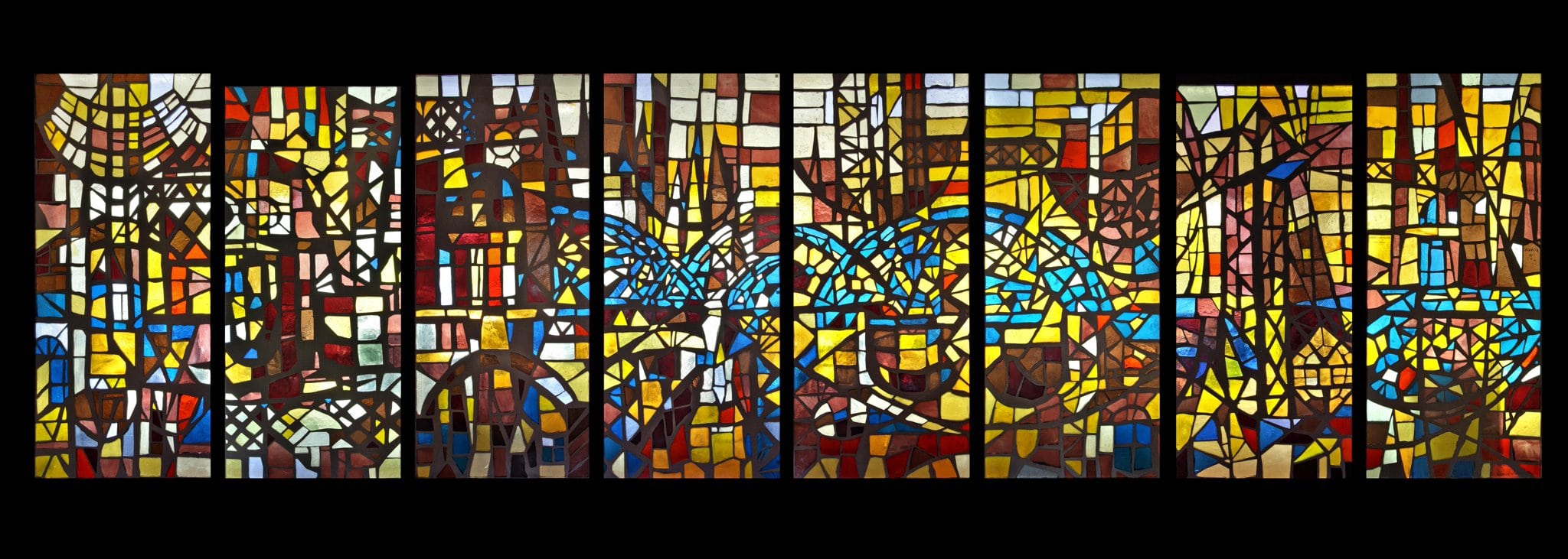 Paroi de verre composée de huit panneaux aux teintes jaunes, brunes, oranges et bleues. Le béton esquisse divers bâtiments.