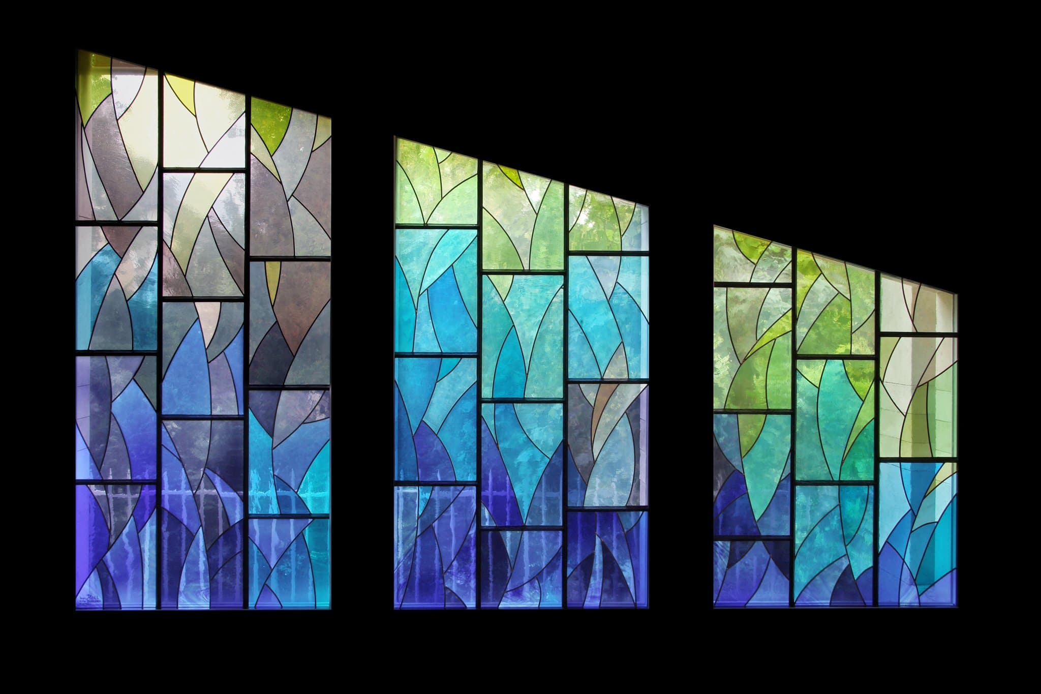 Vitrail composé de verres aux teintes, bleues, vertes, grises et jaunes exprimant l’eau.