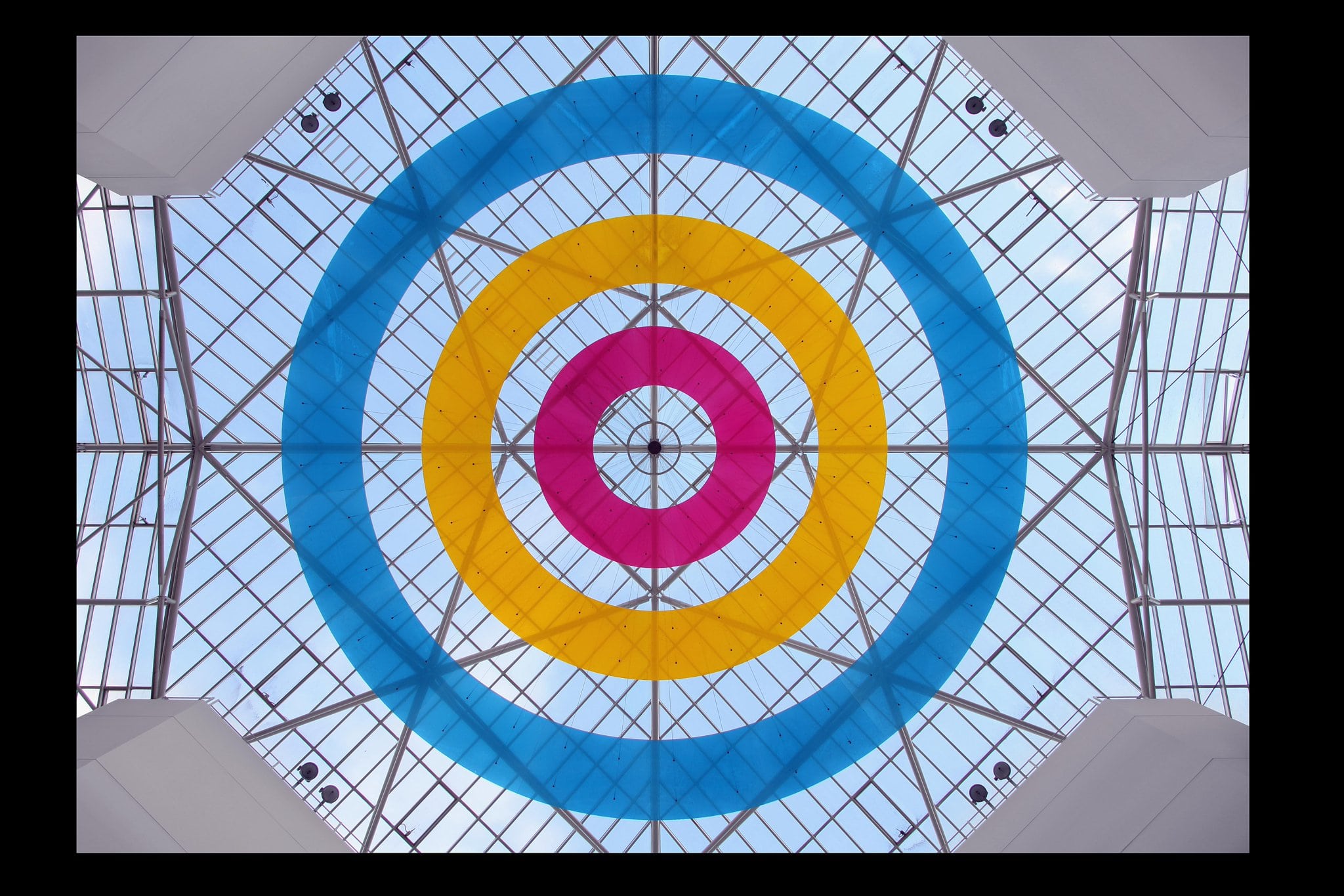 Trois grands anneaux bleu, jaune et rouge inscrits les uns dans les autres sont accrochés sous le faîte de la coupole au centre du hall.