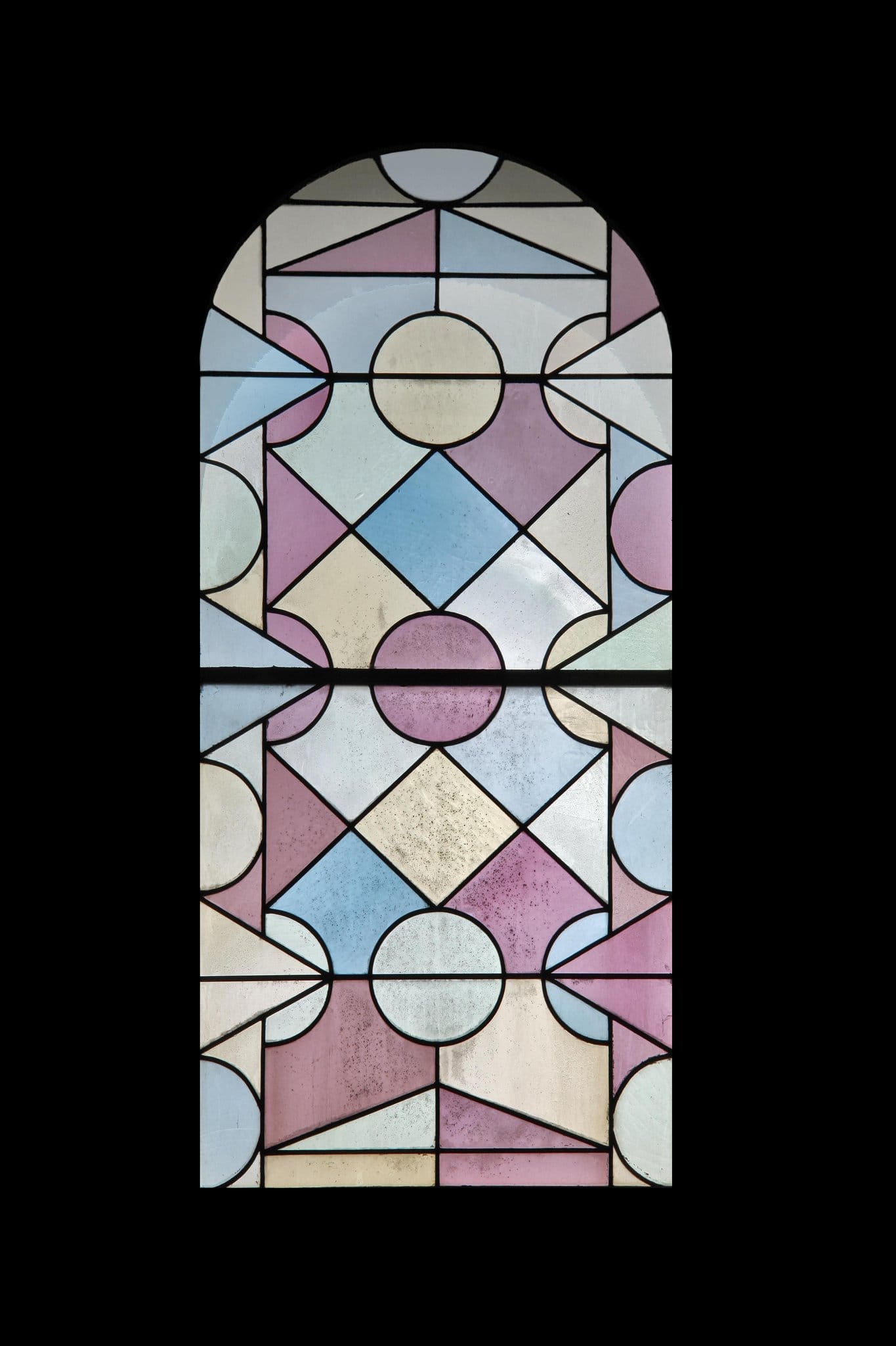 Vitrail ornemental composé de formes géométriques aux teintes grises, roses et blanches.