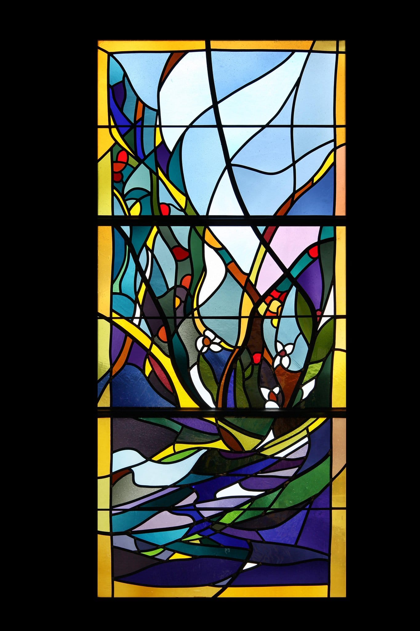 Ce vitrail relate le troisième jour de la Création du monde. Des arbres fruitiers, des fleurs et de l’herbe se dévoilent au coeur de la terre d’où jaillit la sève de la vie. Un liseré d’or encadre la scène.