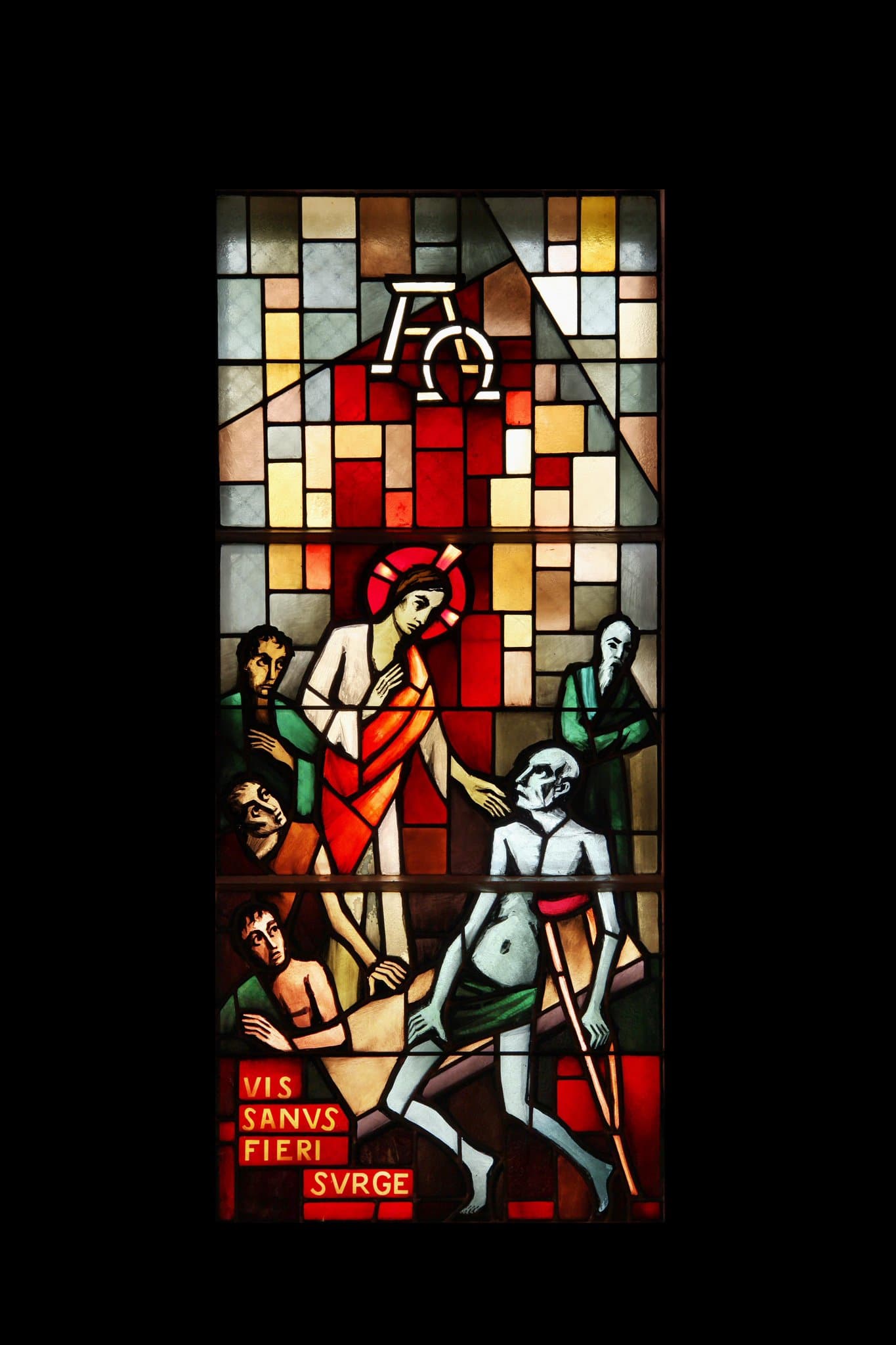 Jésus, entouré de quatre hommes, guérit le paralytique qui se lève de son lit.