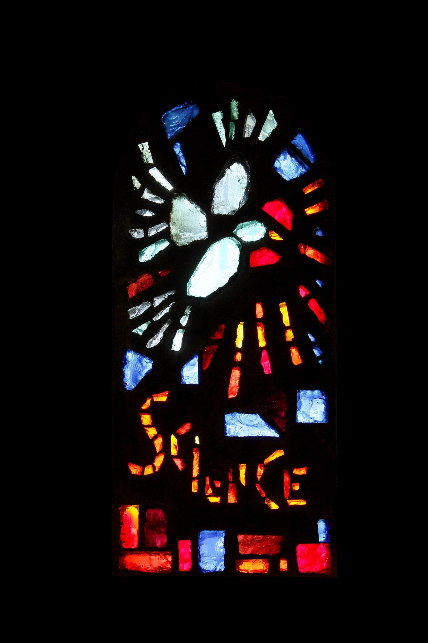 Une colombe en vol, la tête entourée de rayons lumineux.