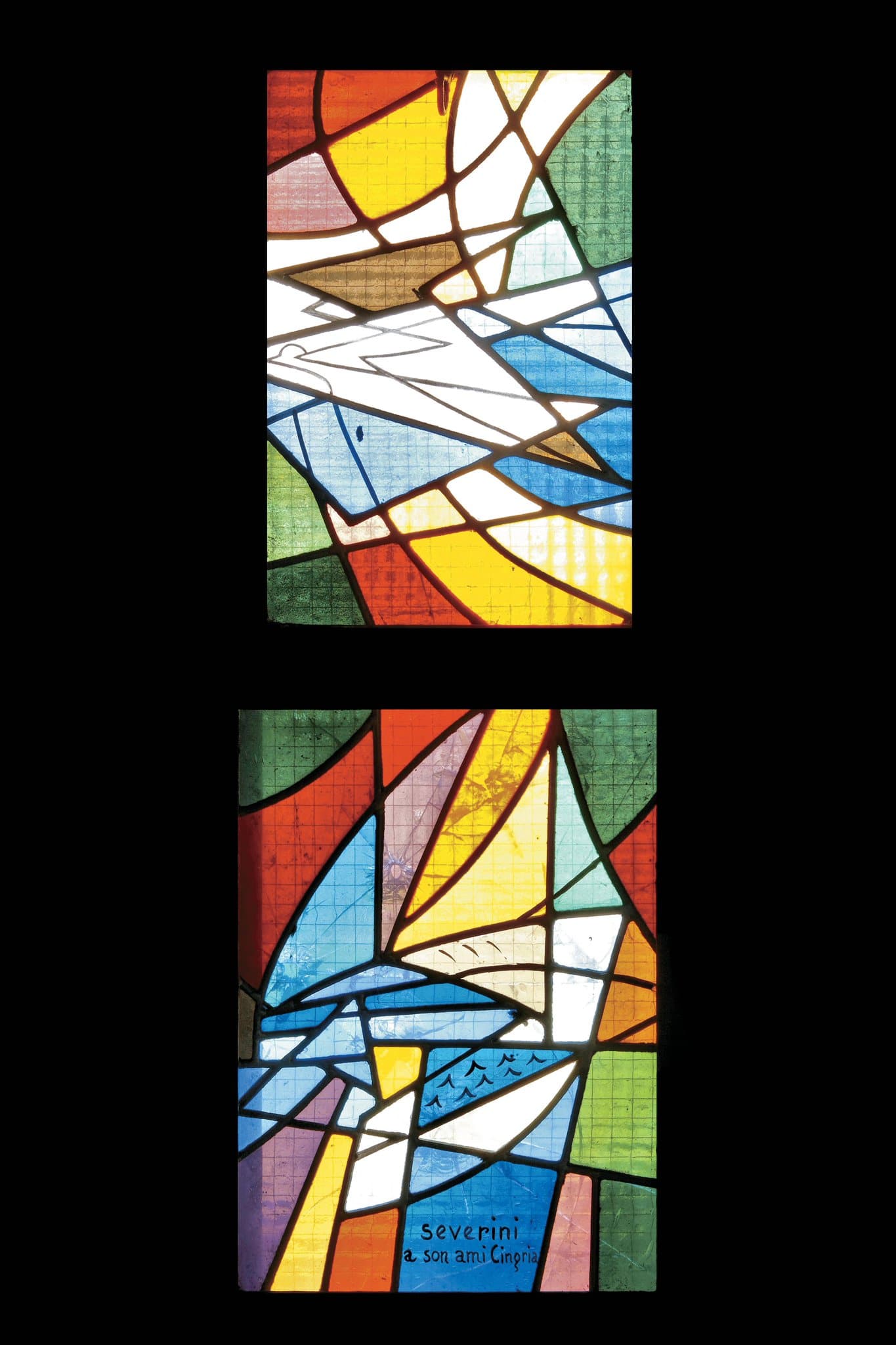 Verrière non-figurative composée de deux panneaux, ce vitrail de Severini est un hommage du peintre italien à son ami suisse Alexandre Cingria, comme l’indique l’inscription au bas de la fenêtre. Les deux artistes ont l’occasion de travailler à plusieurs reprises sur les mêmes chantiers, comme sur celui de l’église de Semsales, au milieu des années vingt, leur première collaboration. Severini s’occupait des peintures murales, alors que Cingria, malgré le souhait du Toscan qui le considérait comme l'un des meilleurs peintres-verriers suisses et souhaitait le voir obtenir la réalisation de l’ensemble des verrières de l’édifice, ne se voit confier que quelques vitraux (Radin, 2011, p. 18). Leurs liens se renforcent les années suivantes. Il se retrouvent encore à Lausanne en 1933 pour la décoration de l’église catholique Notre-Dame, où Cingria réalise les vitraux des lunettes du choeur et de la tribune des chanteurs, et Severini la nouvelle polychromie du sanctuaire et la grande peinture murale de l’abside. On sait par une note issue des archives de la paroisse que Severini s’est rendu à l’atelier Chiara pour “corriger” les vitraux du choeur de Cingria afin que ceux-ci mettent au mieux en valeur la peinture qu’il est en train de réaliser (Severini, 1933). Une vraie confiance s’était forgée entre les deux artistes au fil des années. Severini, comme Stocker, fait don de son vitrail à la paroisse du Petit-Lancy.