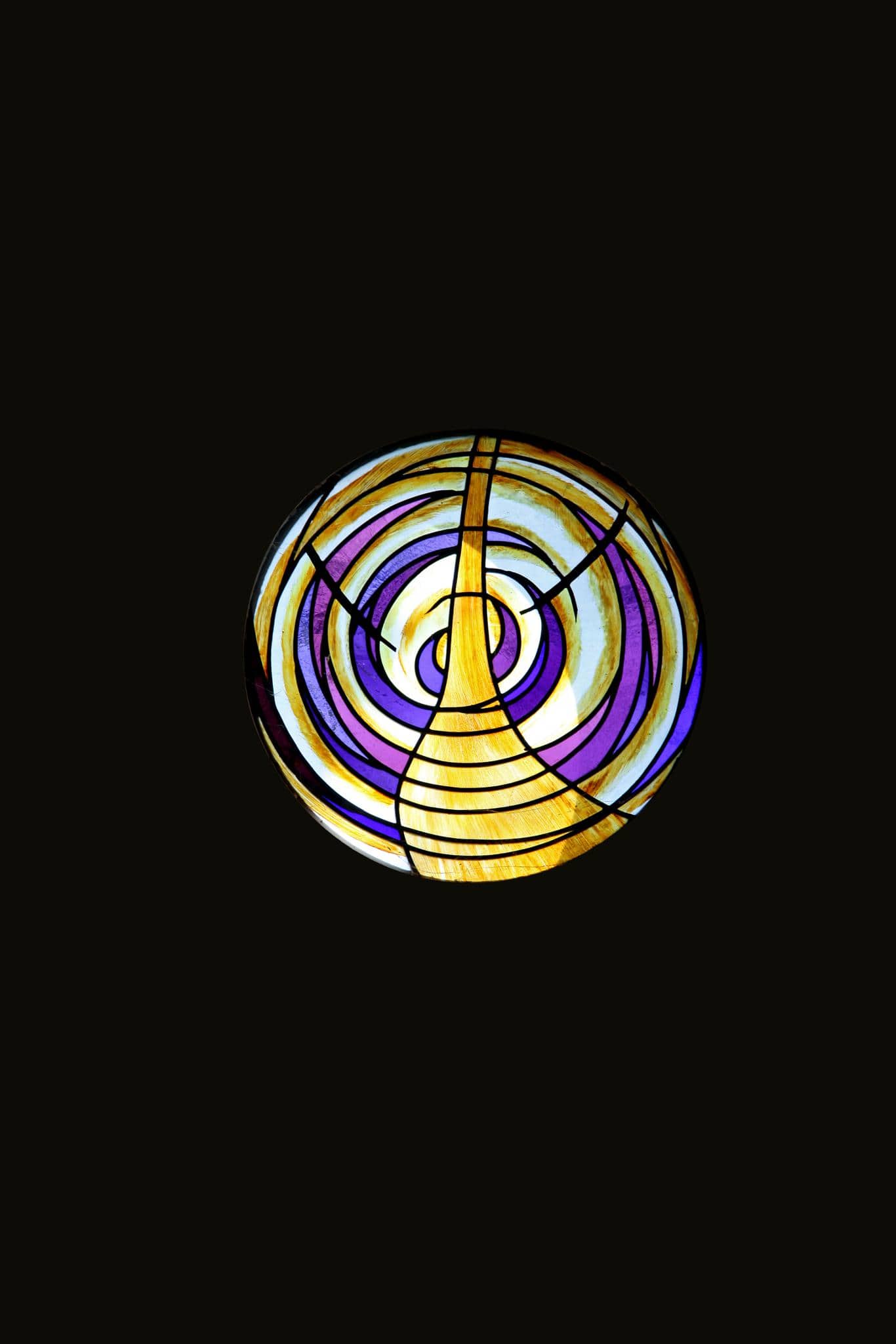 Oculus non figuratif composé d’une spirale mauve et violette au centre de laquelle sort un tourbillon de lumière jaune
