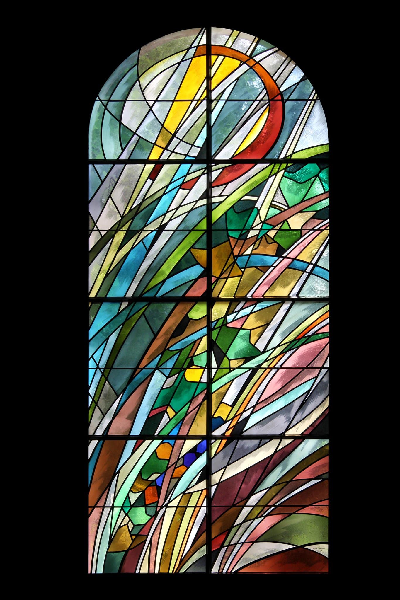 Un paysage pris dans une tempête de vent se déploie sous un soleil voilé.
