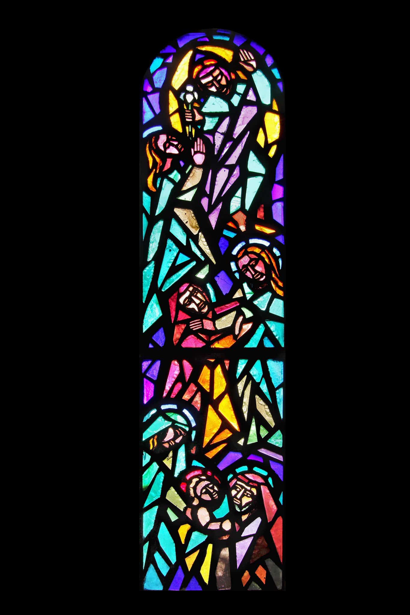 Marie est agenouillée les mains jointes alors que l’ange Gabriel lui apparaît à droite. Il tient un lys blanc (en haut). Marie et Elisabeth se font face et se tiennent par les bras (au centre). Marie et Joseph entourent l’Enfant Jésus (en bas).