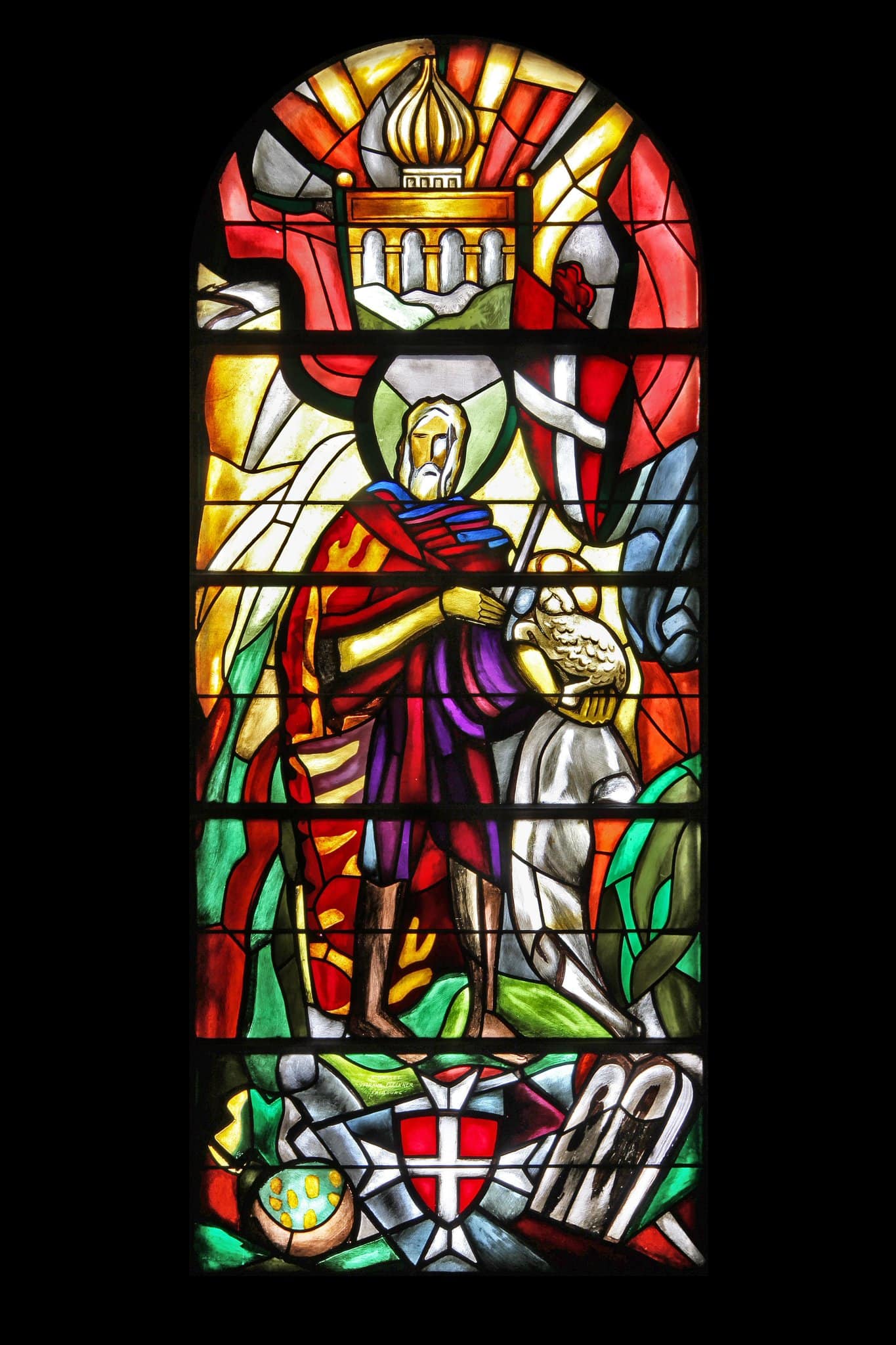 Saint Jean-Baptiste est debout et tient l’agneau. Au-dessus le temple des Chevaliers-de-Saint-Jean-de-Jérusalem. En-dessous, les armoiries de l’Ordre de Saint-Jean de Jérusalem.