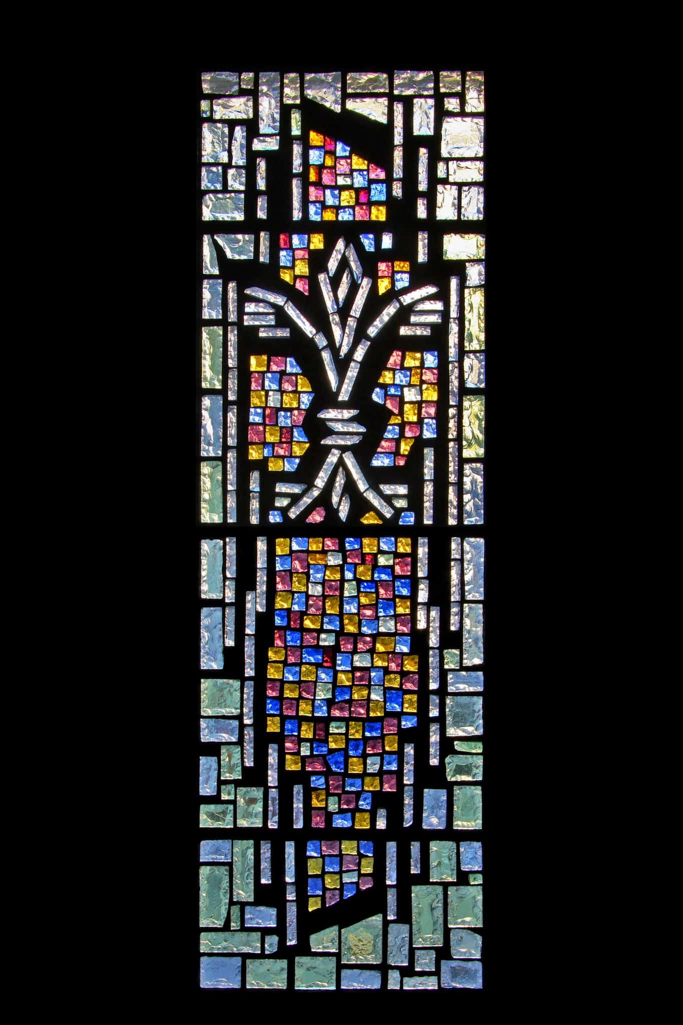 Un lys sur un fond de mosaïque rouge, bleue, blanche et jaune, encadrée d’une bordure claire.