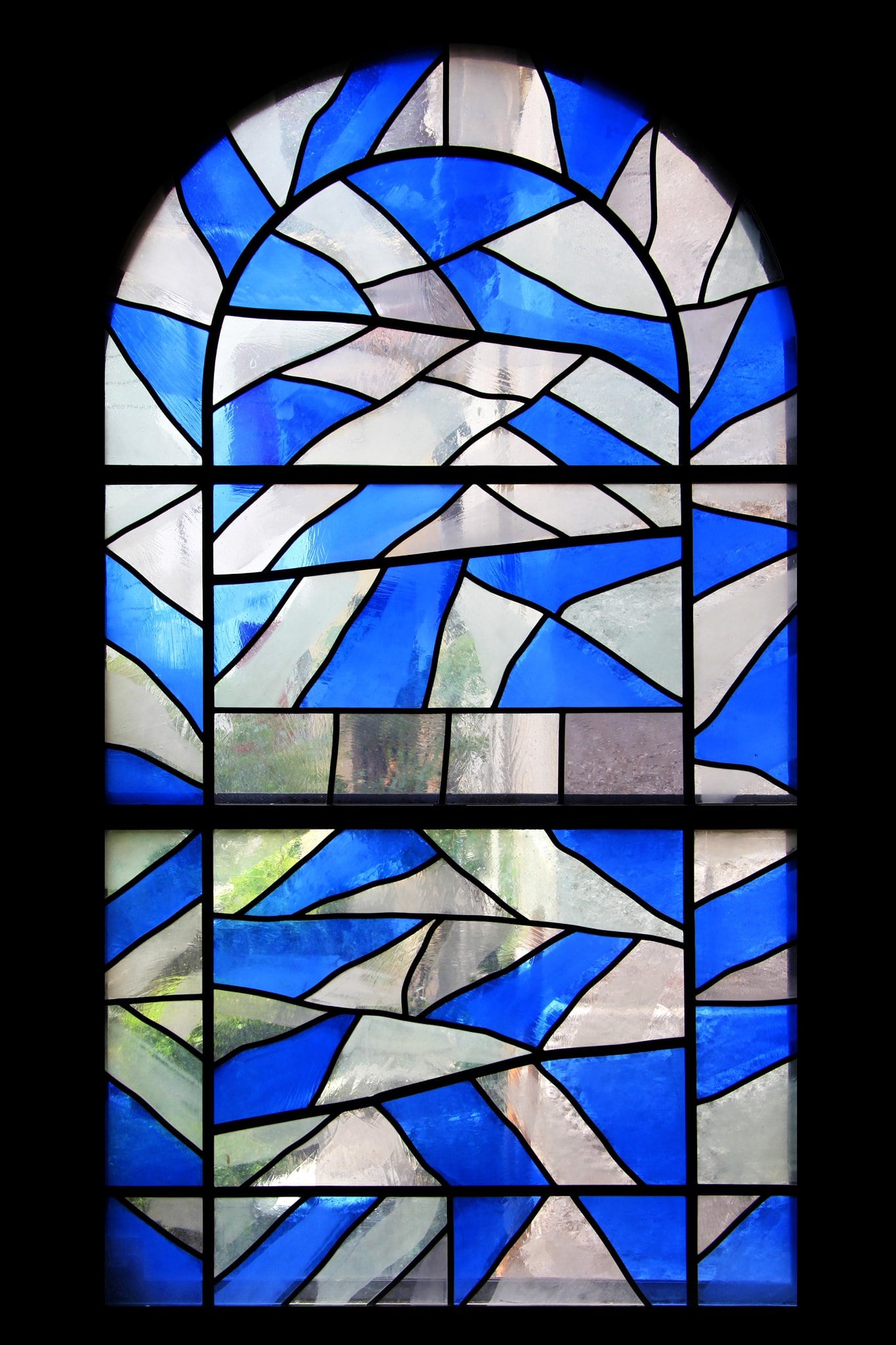 Vitrail non figuratif composé de verres bleux et blancs disposés comme une mosaïque de verre. Le tout est rehaussé de grisaille.
