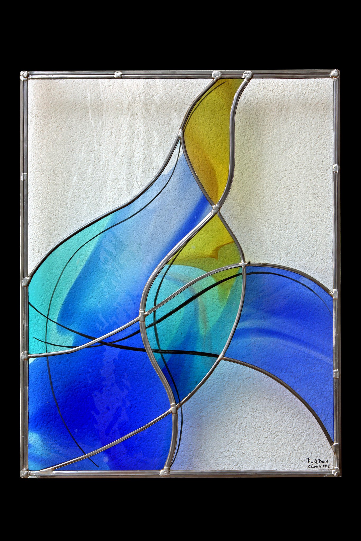 Vitrail non figuratif dans les teintes bleues, jaunes et blanches.