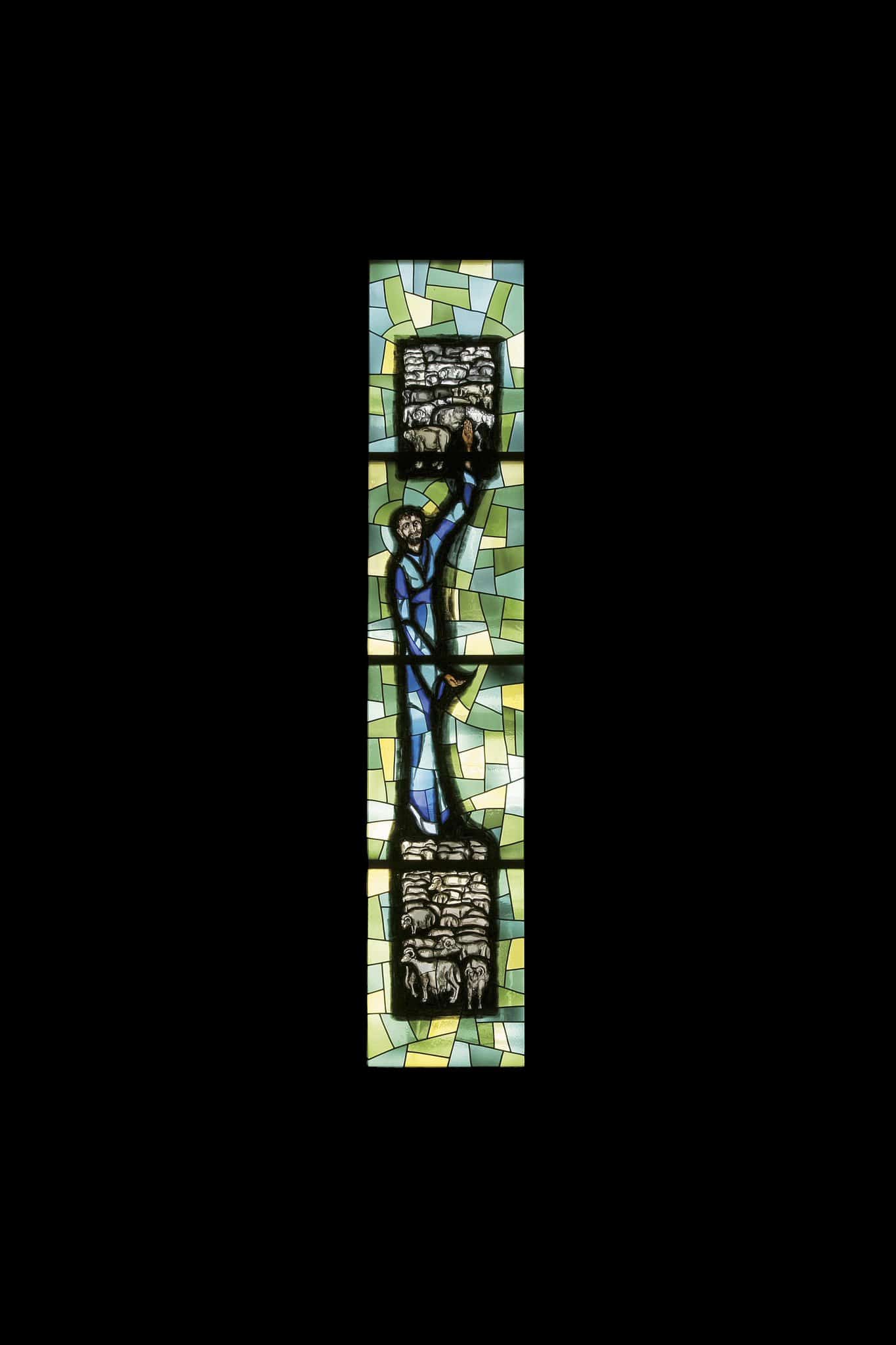 Au centre le berger apparaît un bras levé. Il a séparé en deux troupeaux les brebis et les boucs : les justes et les mauvais.