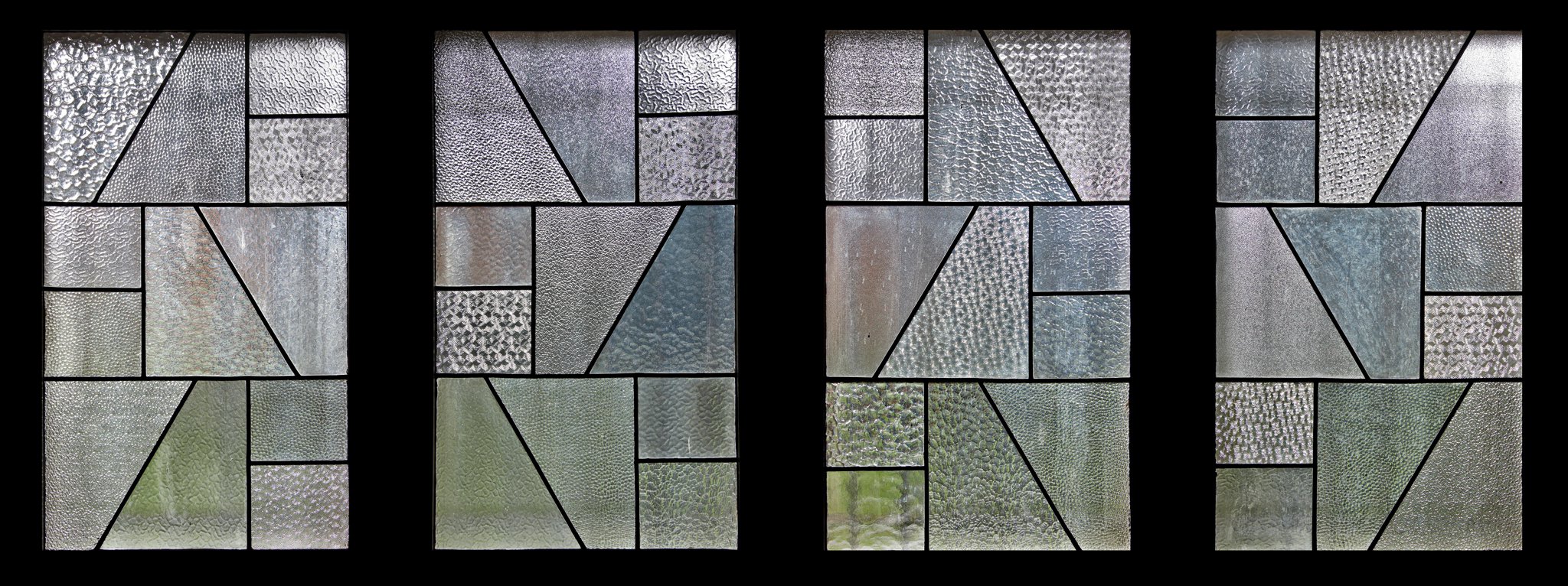 Quatre fenêtres géométriques composées de verres blancs aux structures diverses.