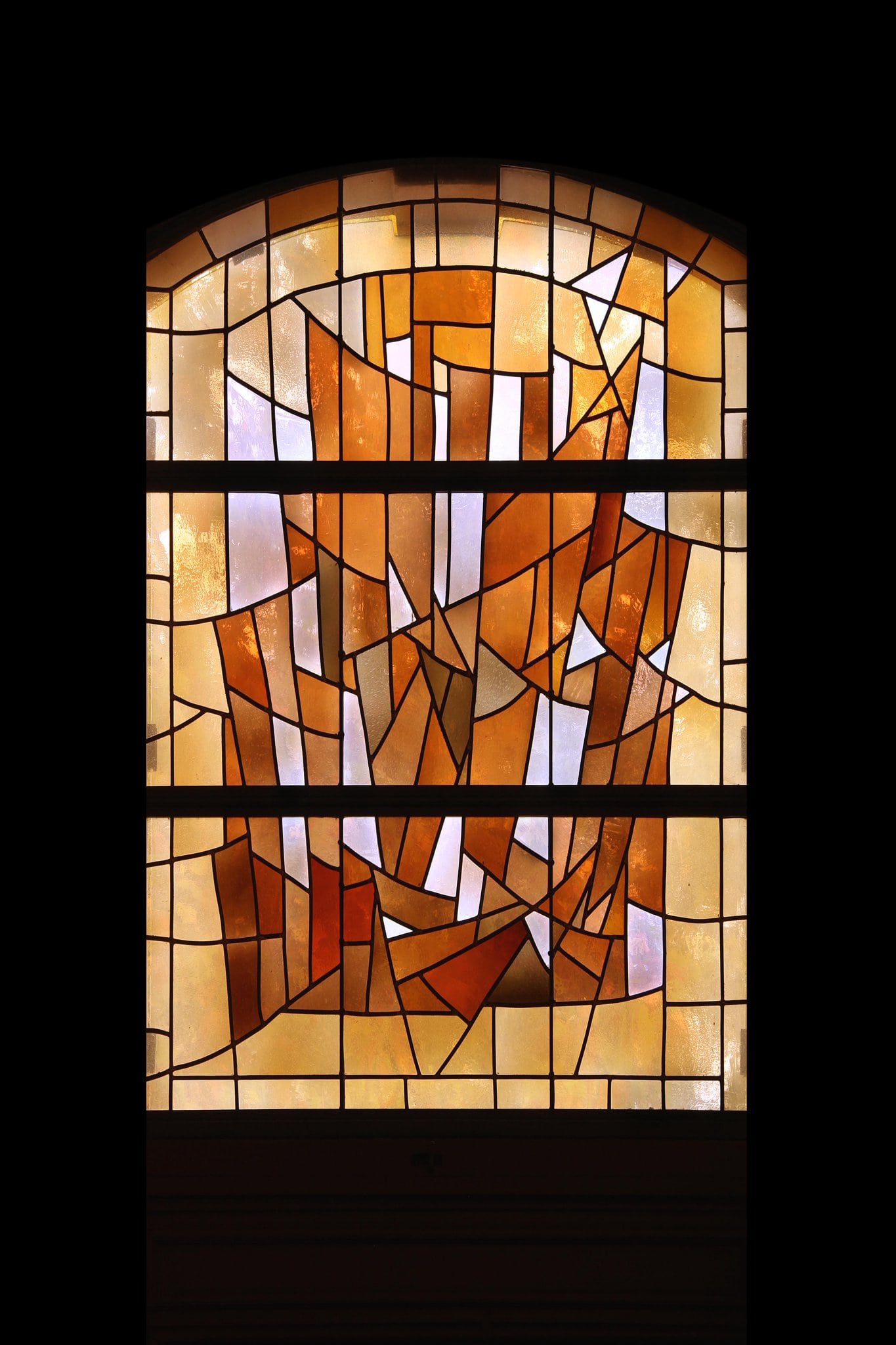 Vitrail non figuratif composé au centre de pièces de verre brunes, beiges, oranges et blanches et entouré d’une bordure beige.