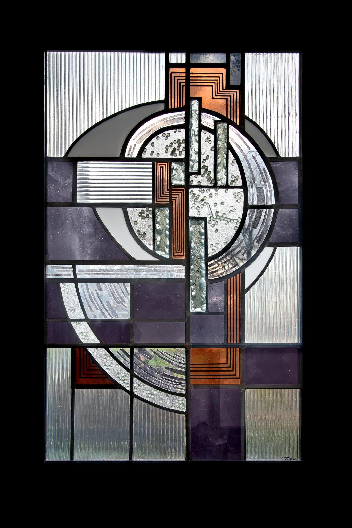 Vitrail composé de plusieurs formes géométriques aux structures et matières différentes inséré dans une grande baie vitrée.