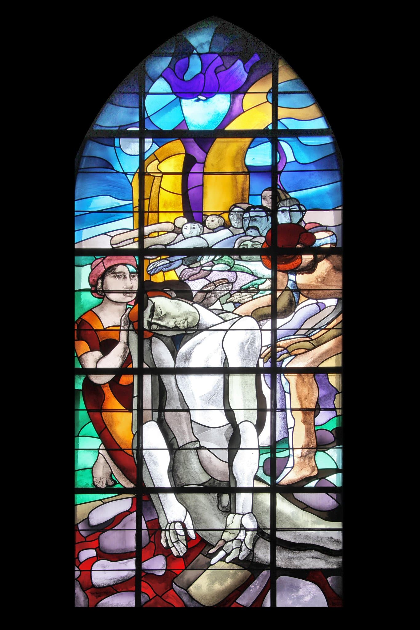Au centre le corps nu d’un homme sans vie est soutenu par une jeune femme agenouillée à ses côtés. C’est le Christ mais aussi tous les suppliciés, victimes de la haine. Il offre un message de vie et d’espérance à la foule solidaire réunie autour de lui, les bras tendus. Au-dessus apparaît la colombe et le soleil au milieu d’un ciel sombre.