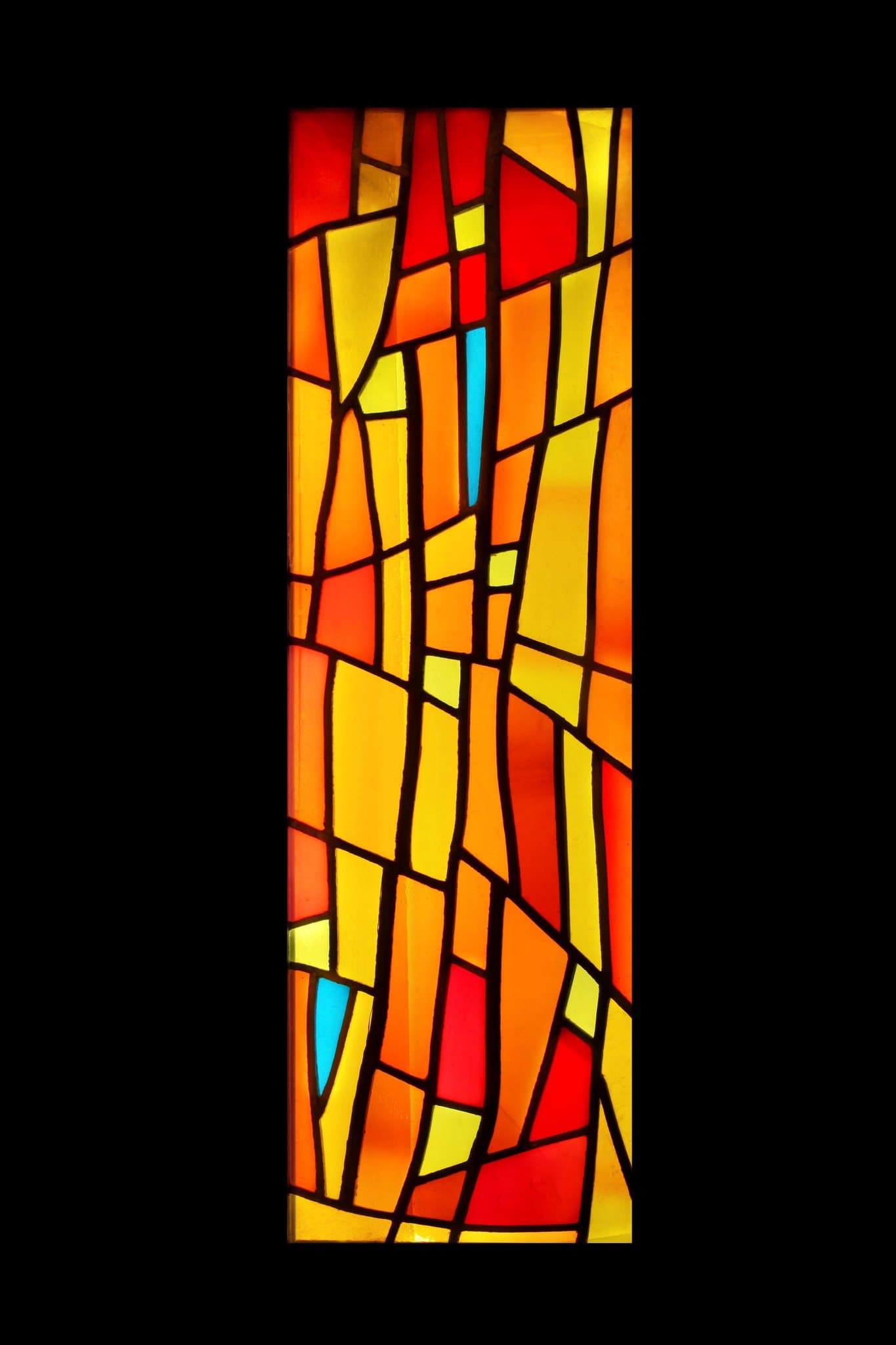 Vitrail non figuratif composé de tons chauds oranges, jaunes et rouges avec des touches de vert et de bleu.